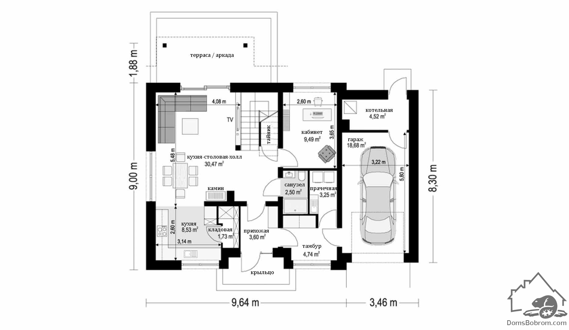 На первом этаже дома расположены: гостиная, холл и кухонное пространство, лестница на чердак, дополнительное помещение, подсобные помещения, гараж и котельная. В проекте много места было уделено подсобной части и кладовке. Расположение котельной позволяет установить как газовый котел или тепловой насос, так и твердотопливный котел.