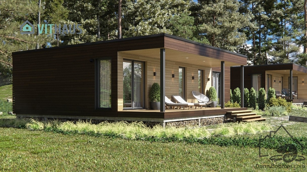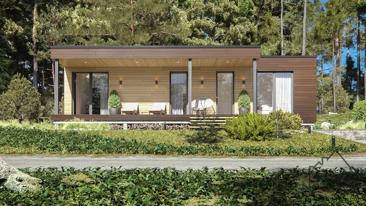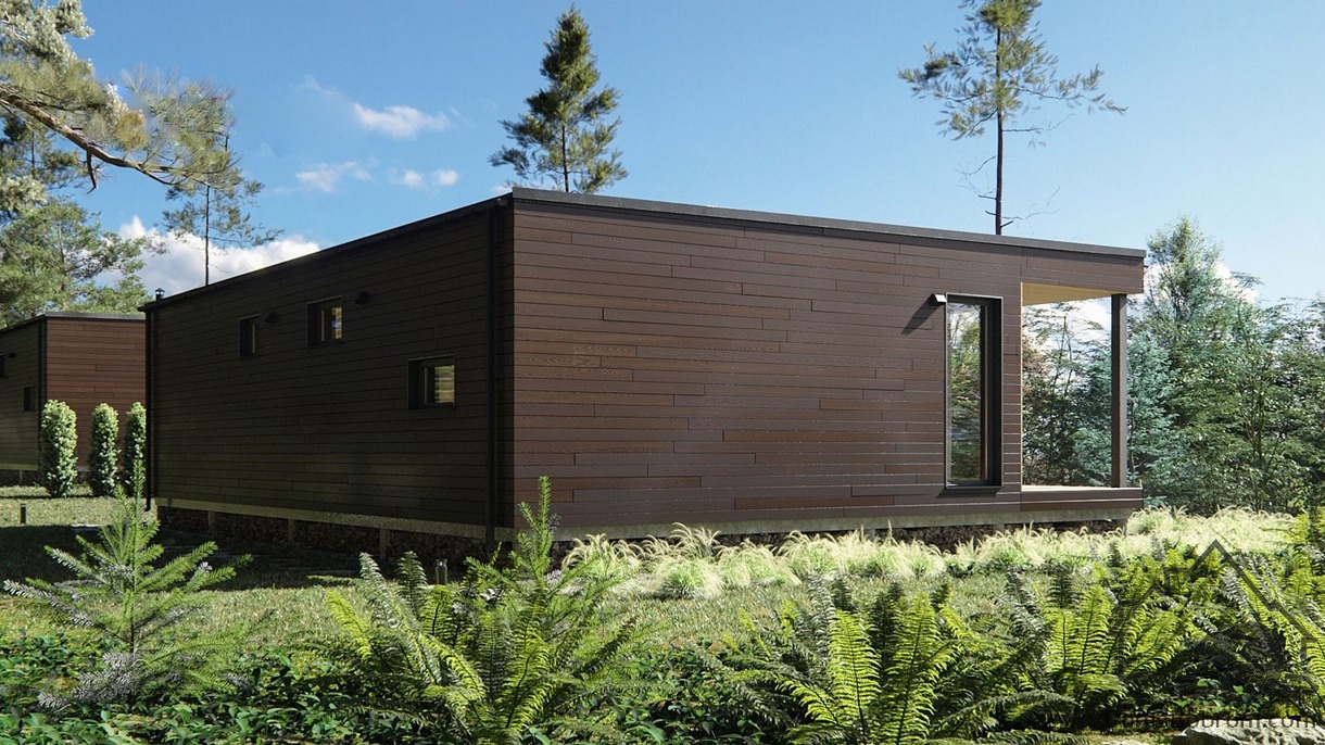 В доме Nelio имеется 2 спальные комнаты, кухня-гостиная, санузел, кладовка, тамбур, терраса. При необходимости дом можно будет легко достроить вверх или в стороны. Два выхода из дома позволяют использовать жилое пространство по-максимуму. Подходит для постоянного проживания 3-4-х человек.
