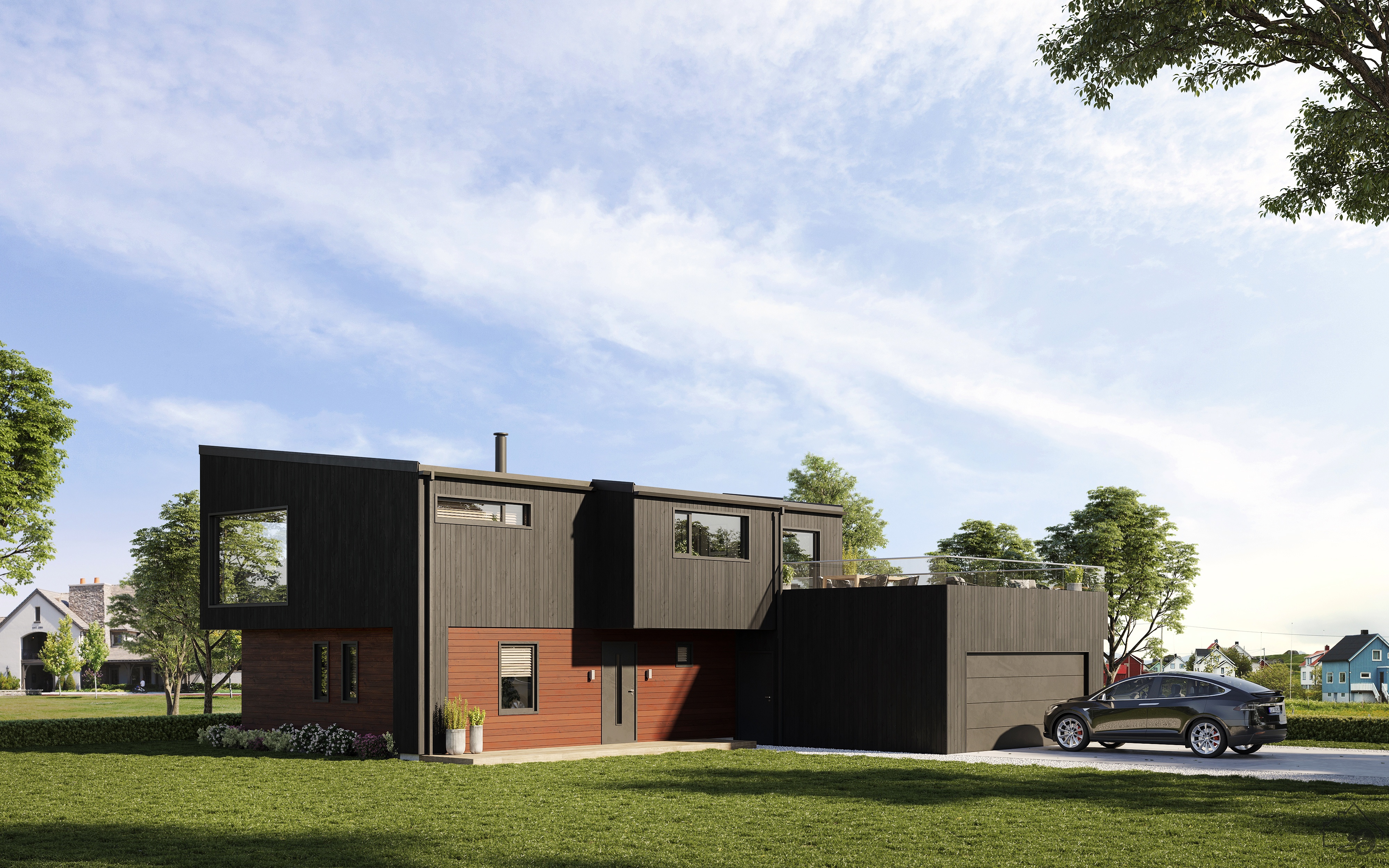 Дом Oniks - это современный дом с плоской односкатной крышей и большой террасой на крыше над гаражом. Дом получился светлым и открытым, гостиная и кухня находятся на 2 уровне, а приватная зона спален - на первом. Большие окна подчеркивают выразительность и индивидуальность дома.