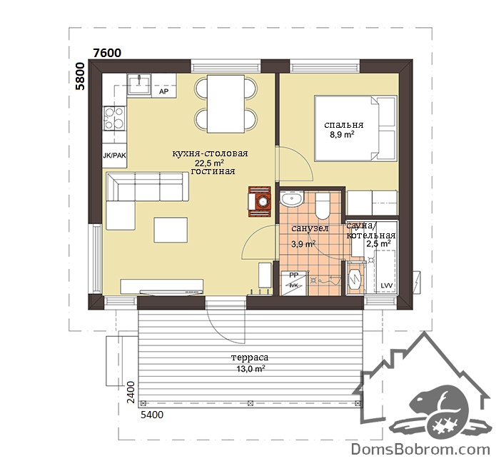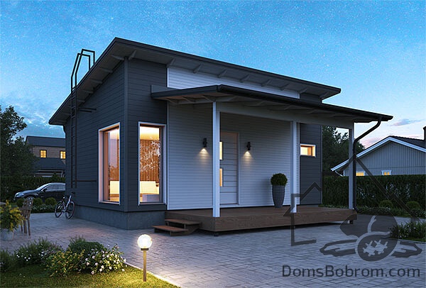 Эффективное использование пространства позволило реализовать все необходимые функции дома на площади всего 48 м². Внутри можно спроектировать сауну или котельную.