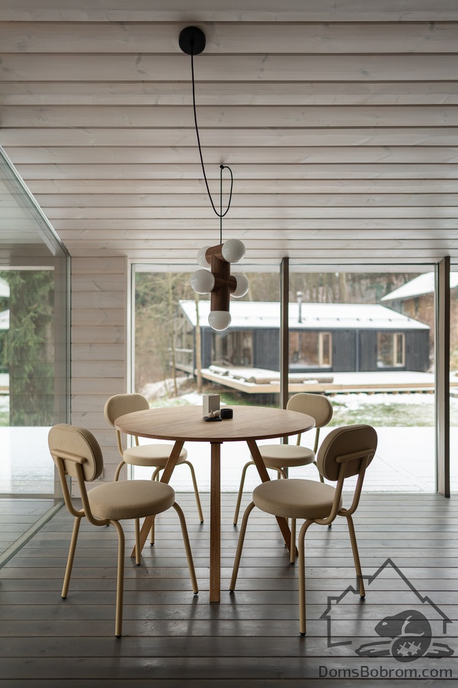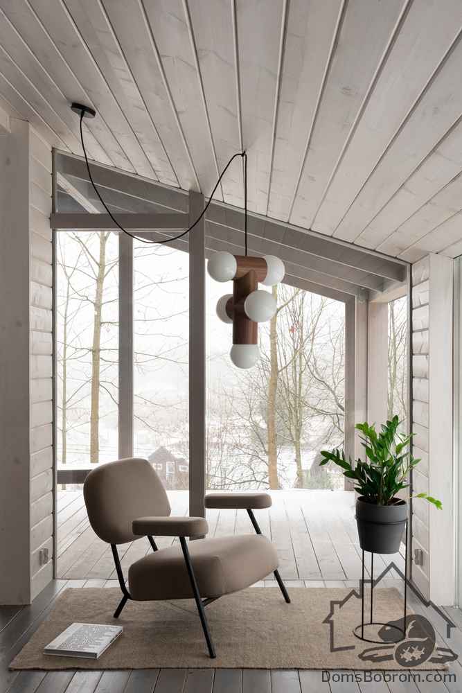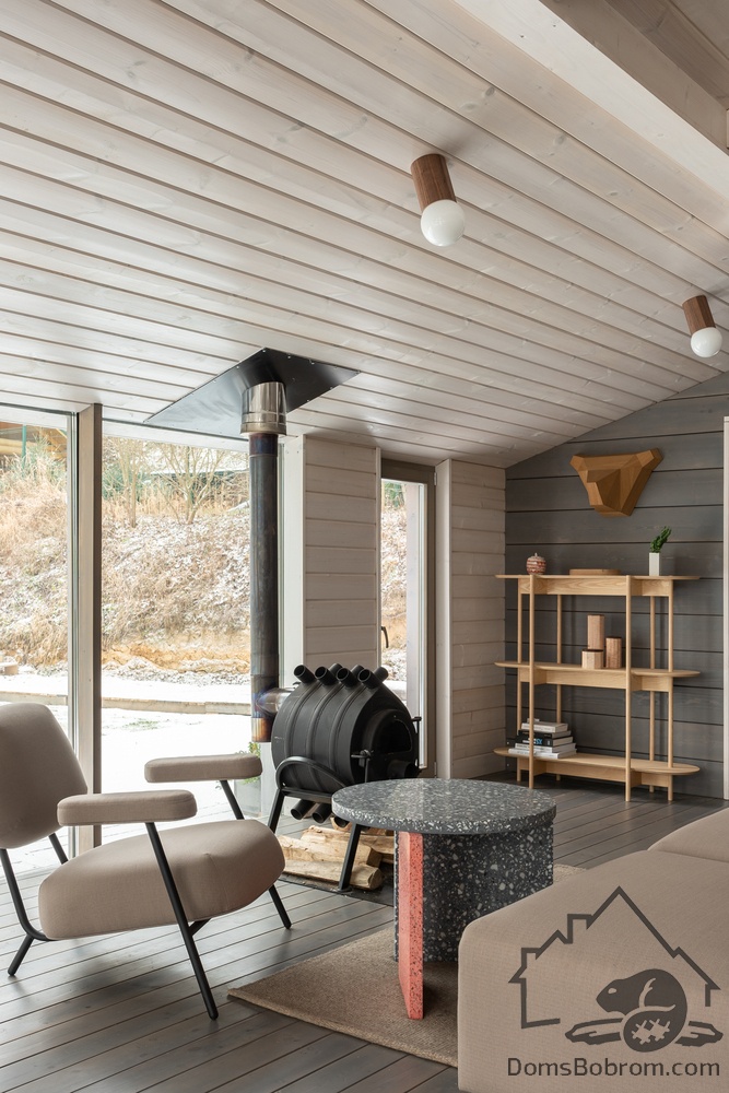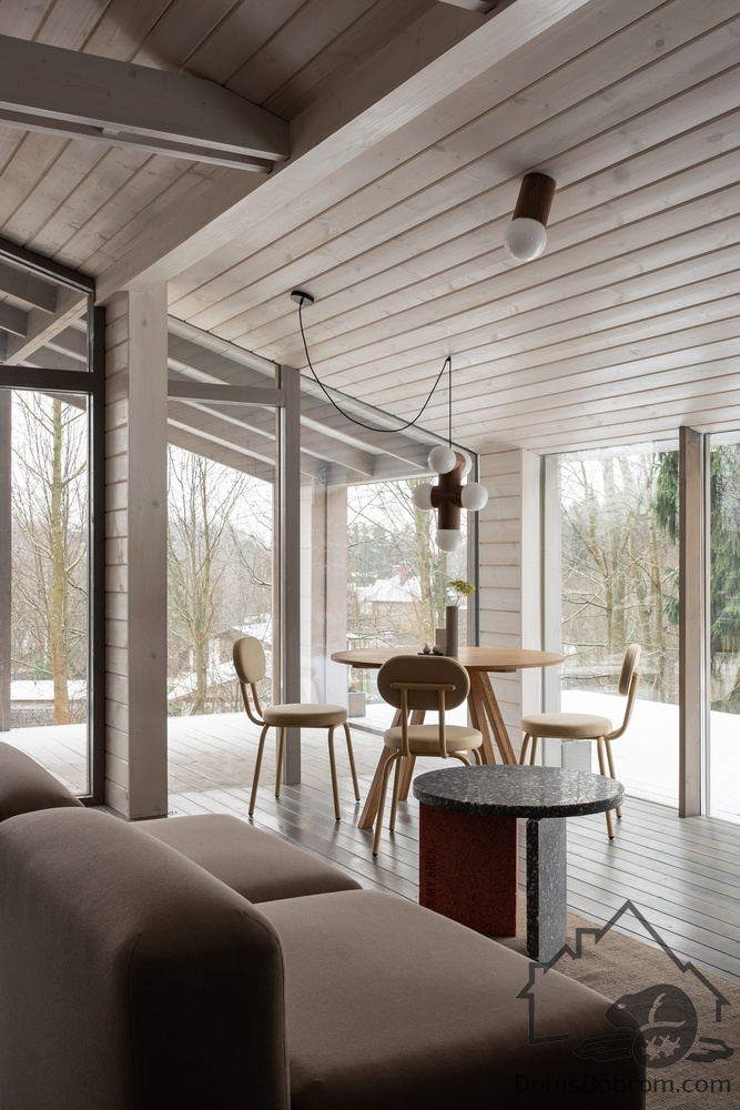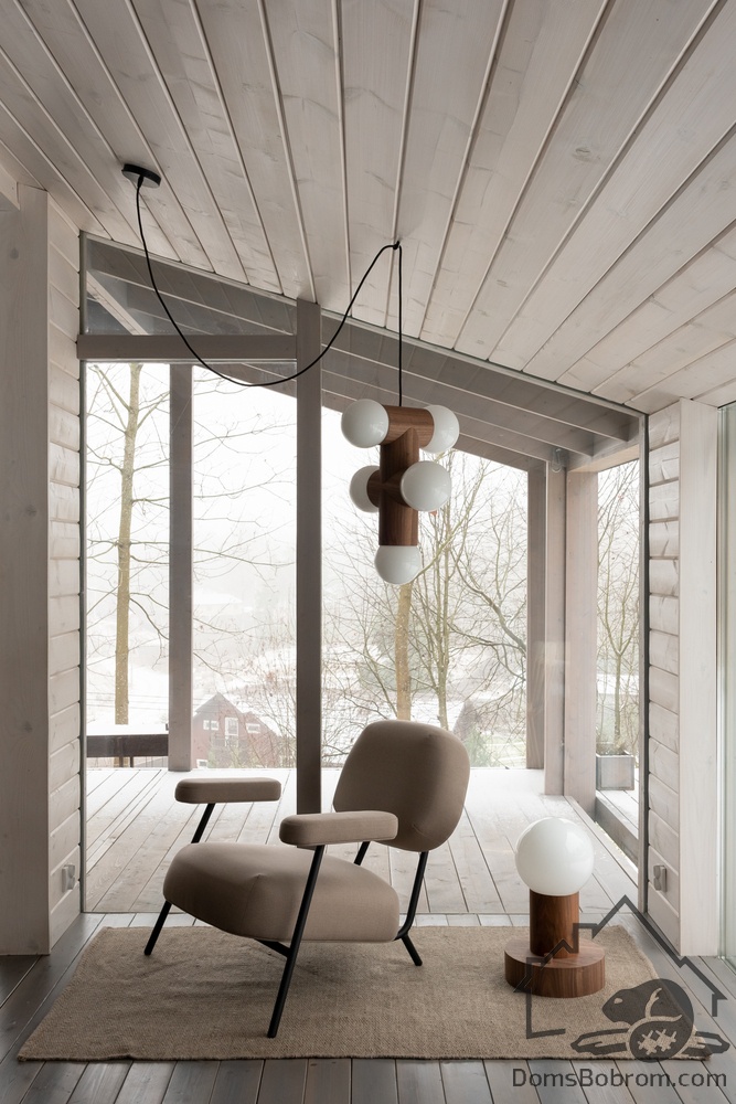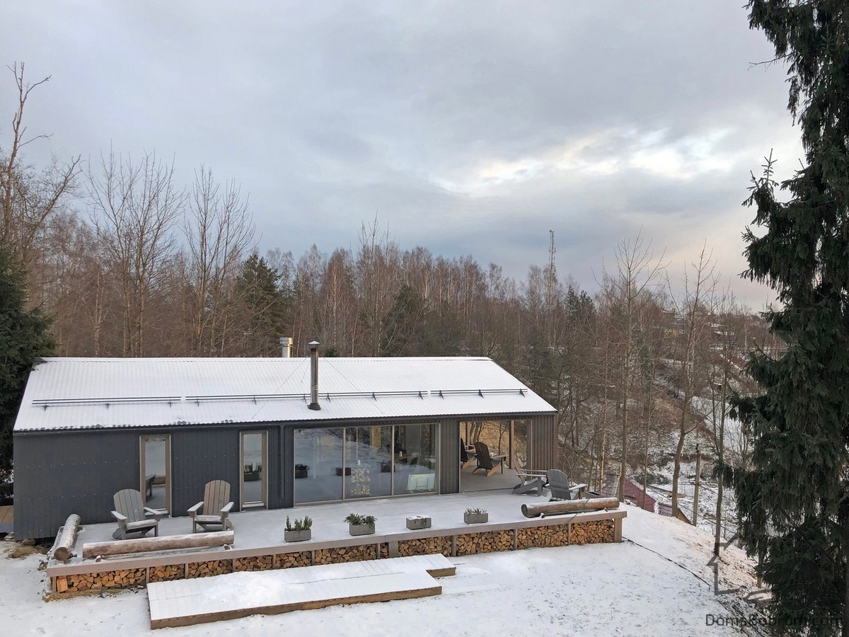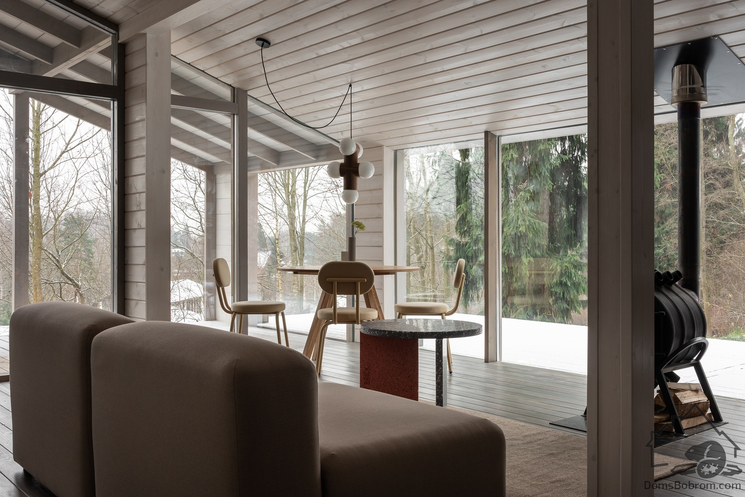 Проект реализован в 2019 году в поселке Порошкино под Санкт-Петербургом, Россия. На небольшой площади в 70 квадратных метров в доме оборудованы 2 спальни, просторная студия-кухня с панорамным остеклением, прихожая, санузел и большая веранда. Для создания интерьера, воплощающего образ современного русского жилища и отражающего современную культуру и локальный контекст Петербурга, были приглашены санкт-петербургские дизайнеры (DELO DESIGN).
