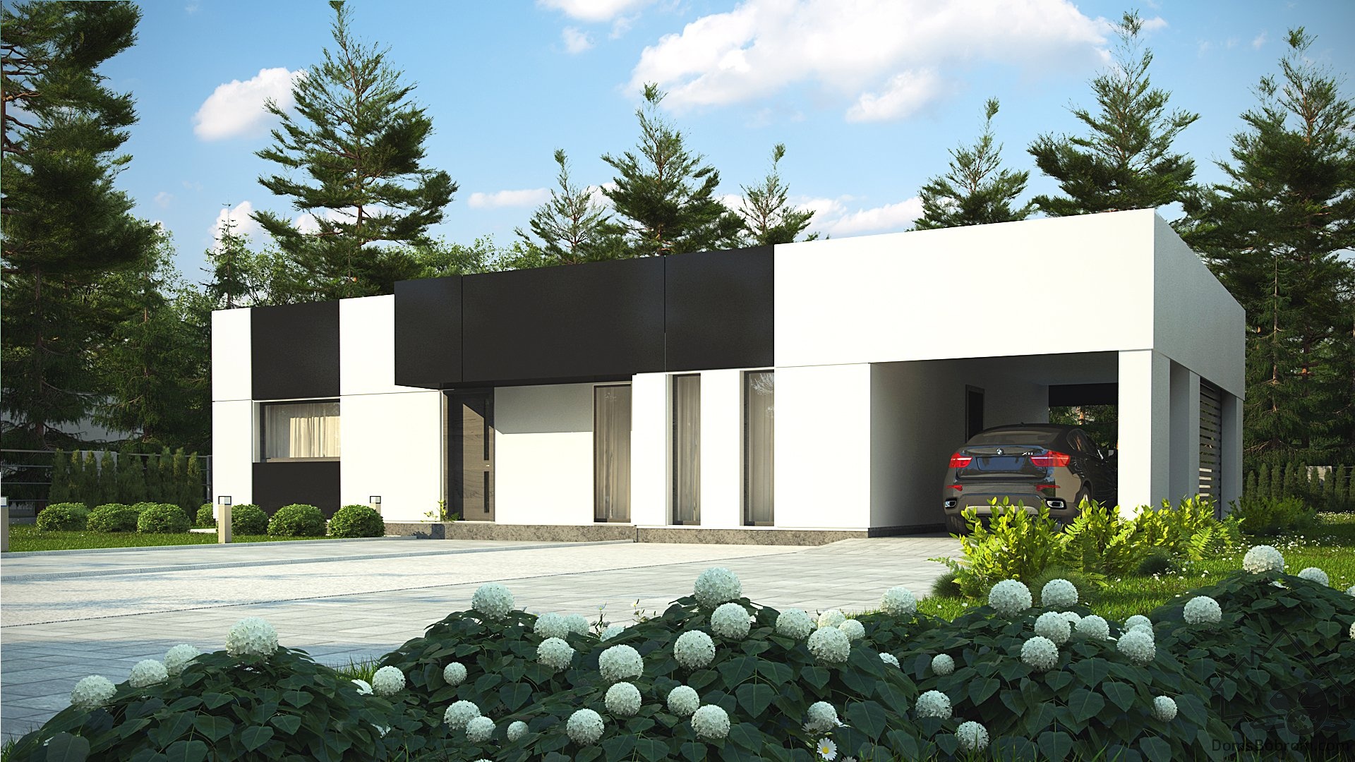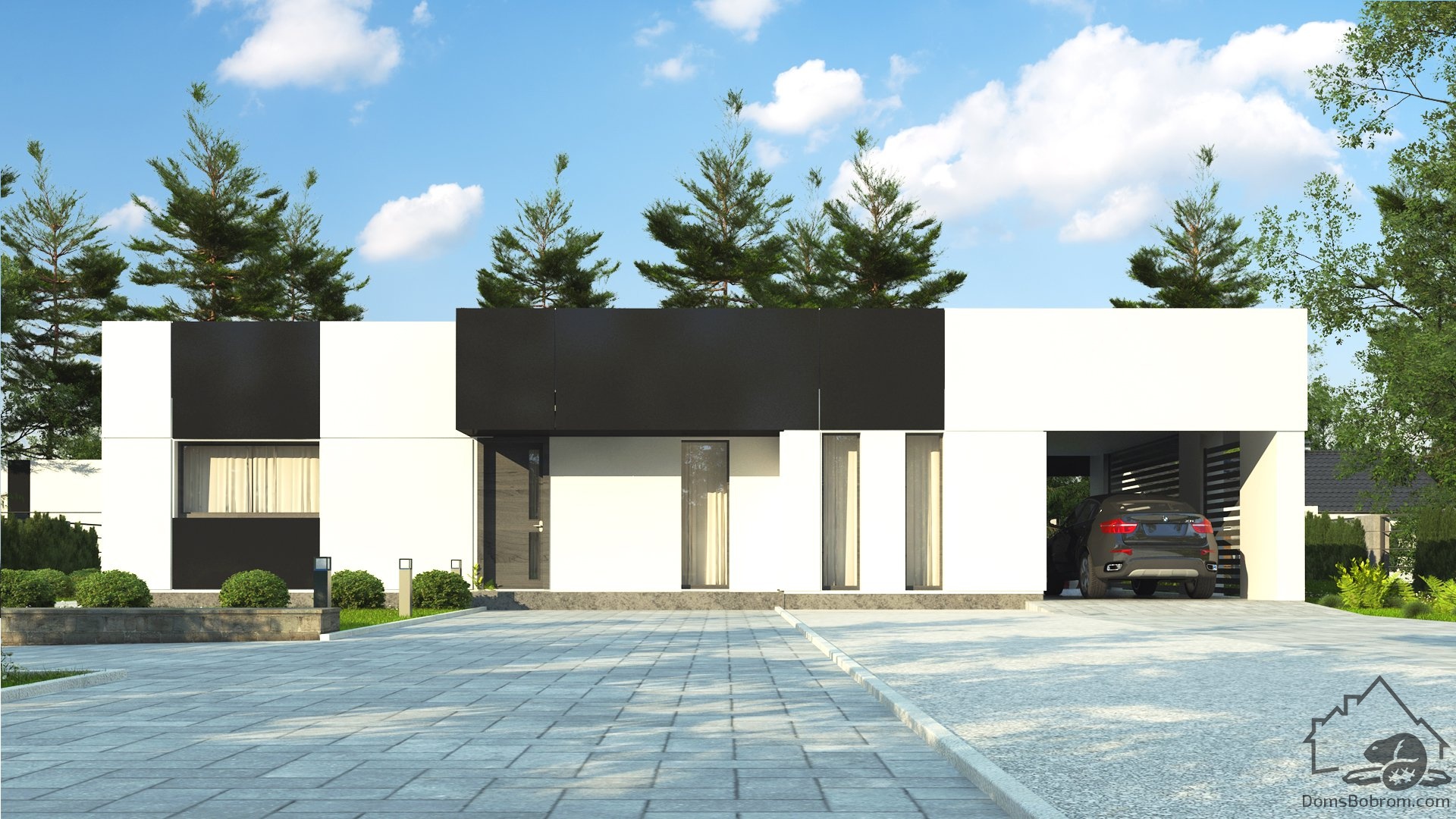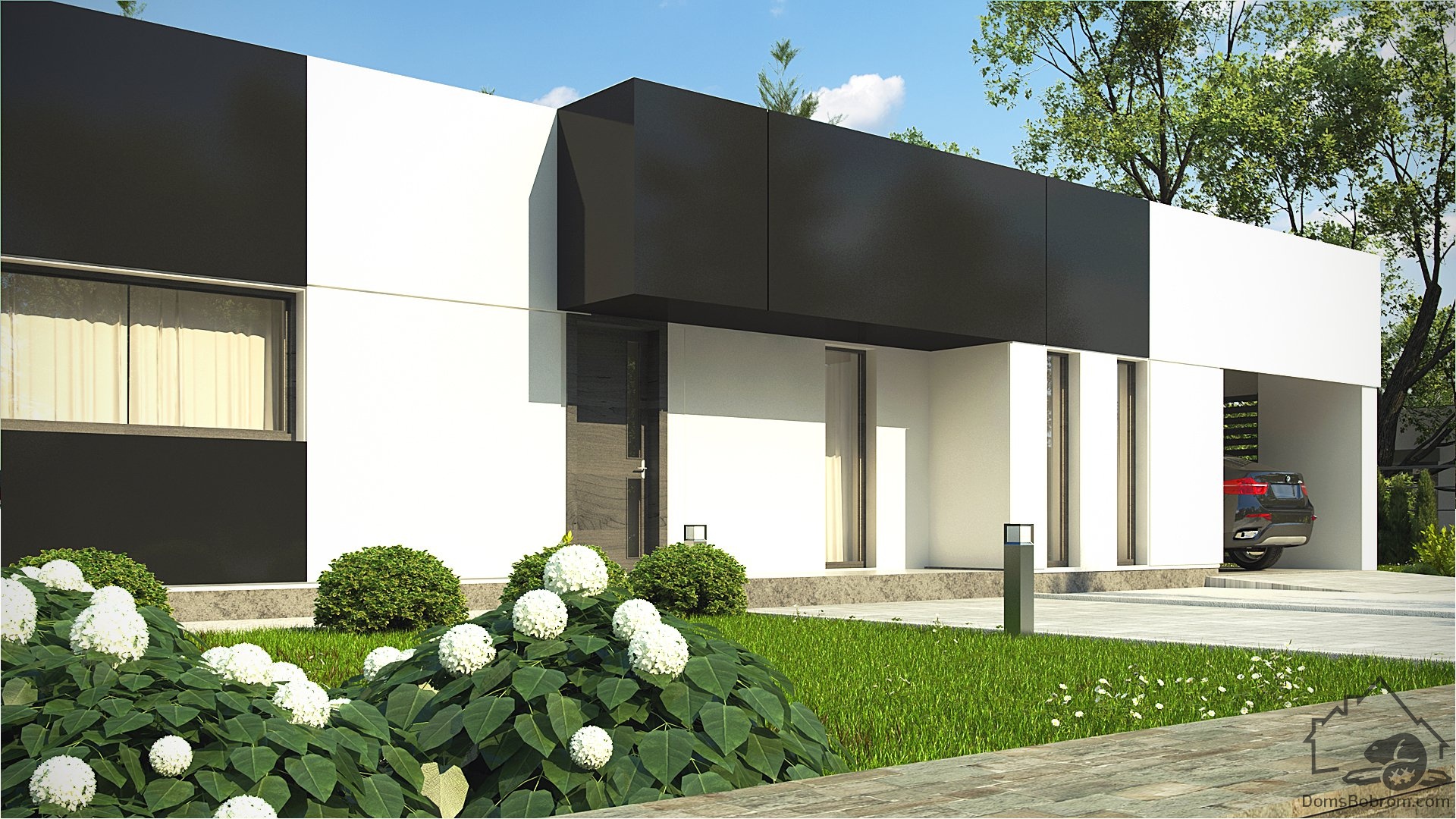 Дом Рависсант - это компактный одноэтажный стильный дом с плоской крышей и открытым гаражом для двух машин.