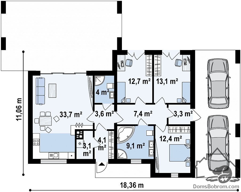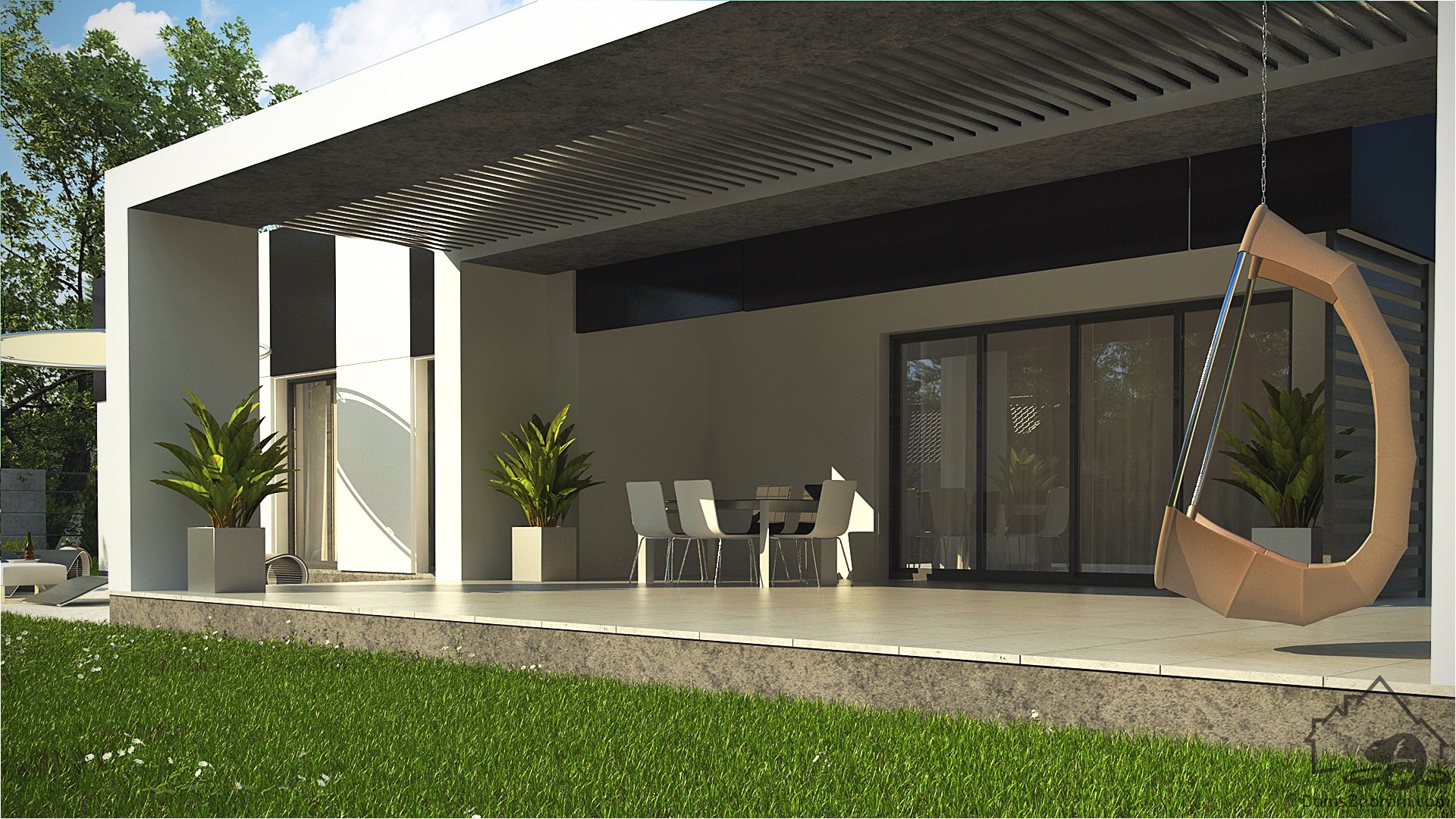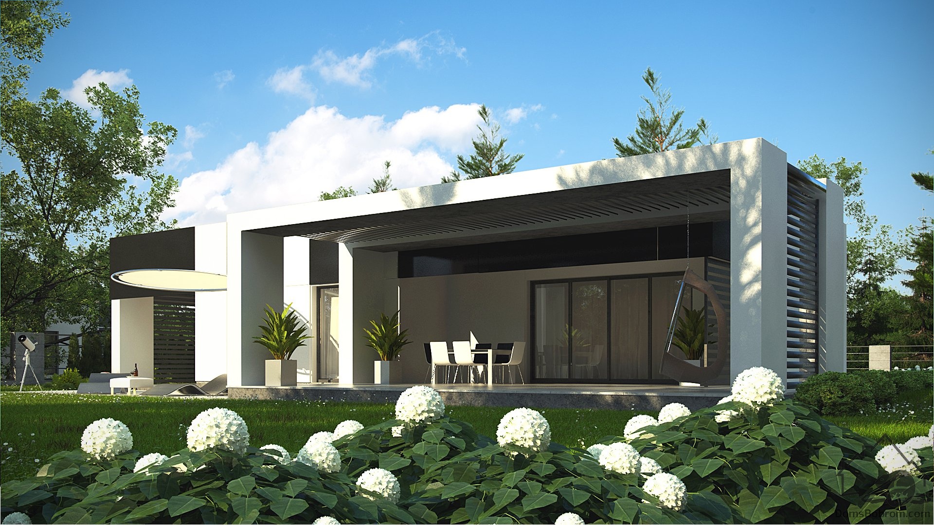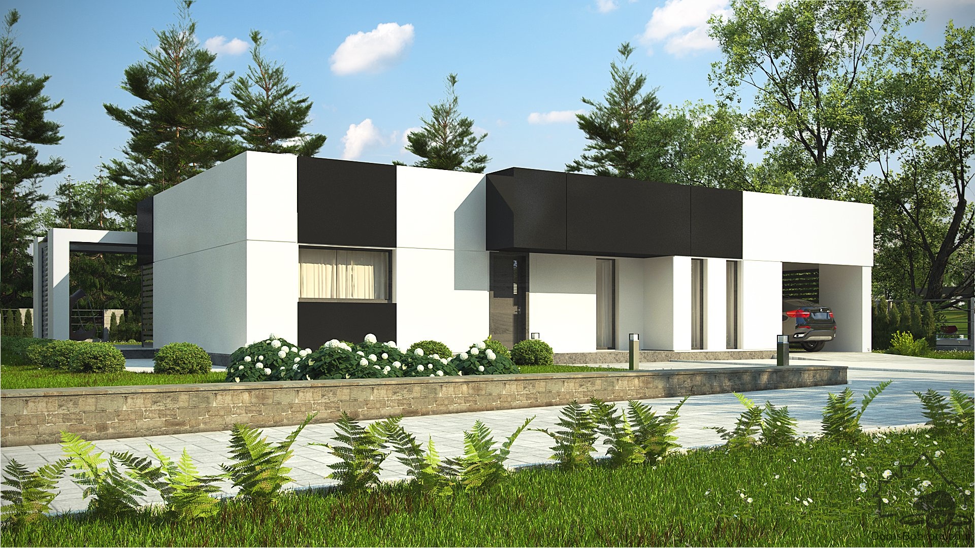 Дом Рависсант - это компактный одноэтажный стильный дом с плоской крышей и открытым гаражом для двух машин.