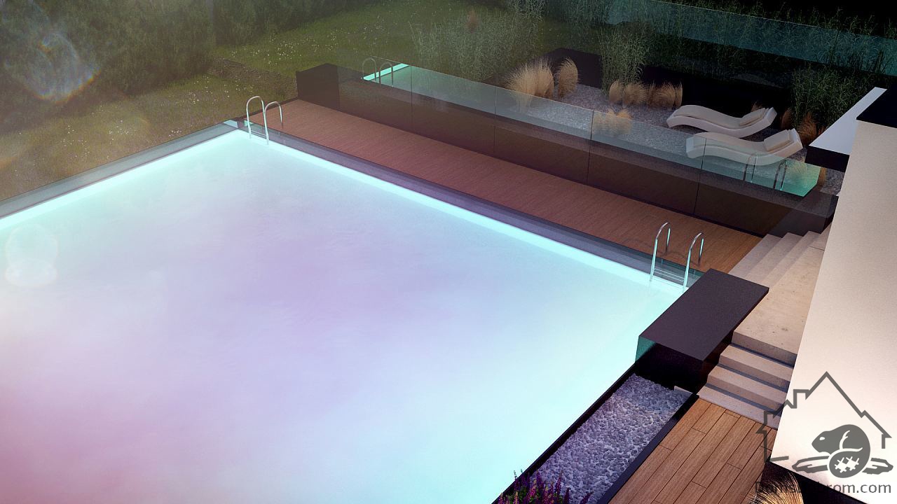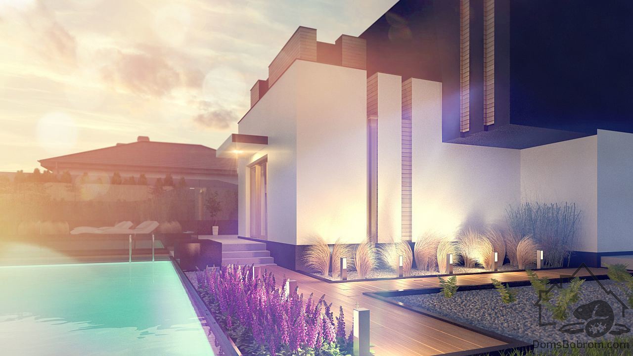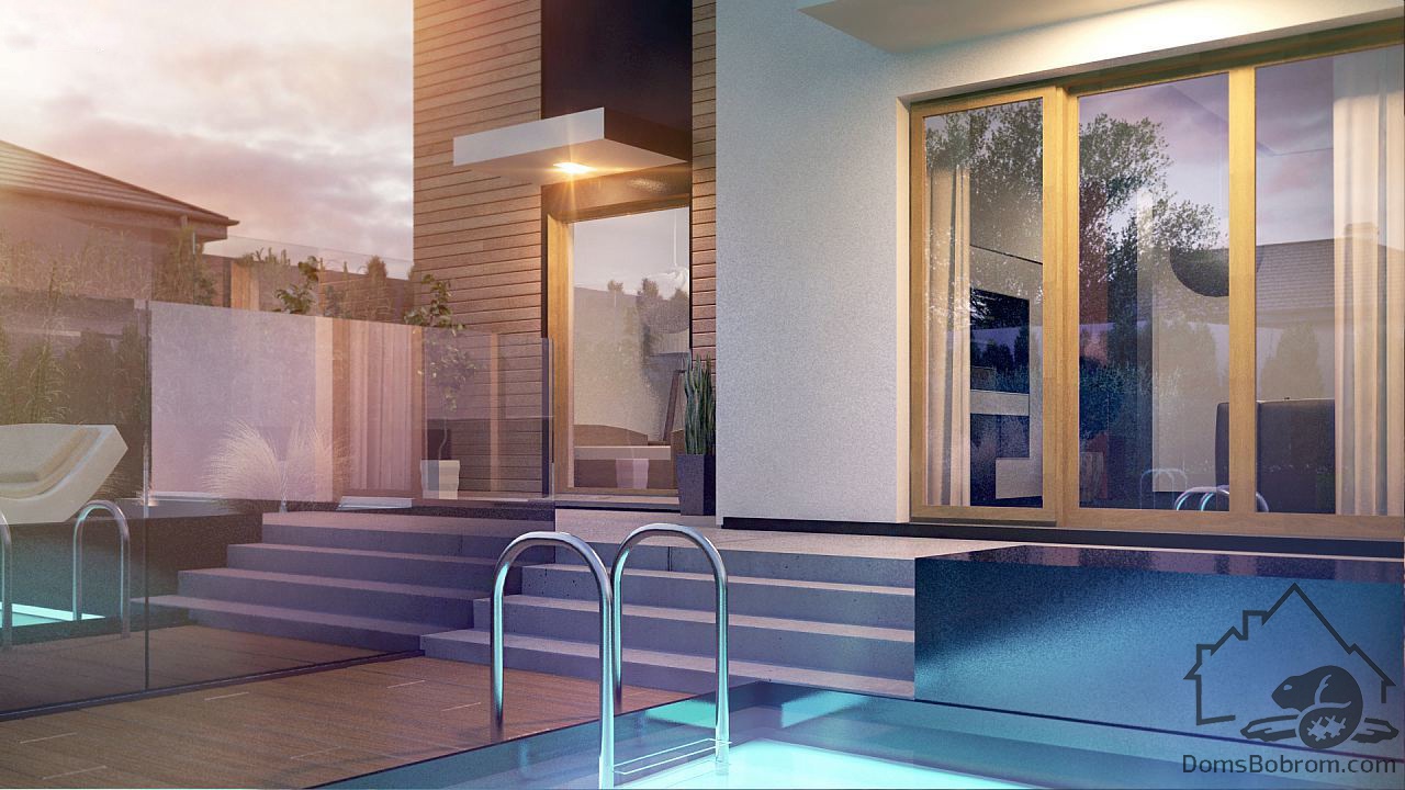 В классическом варианте на первом этаже расположена зона кухни-гостиной-столовой. С террасы есть спуск к бассейну в саду. Помещение, расположенное рядом с гостиной, можно использовать как кабинет или дополнительную спальню.