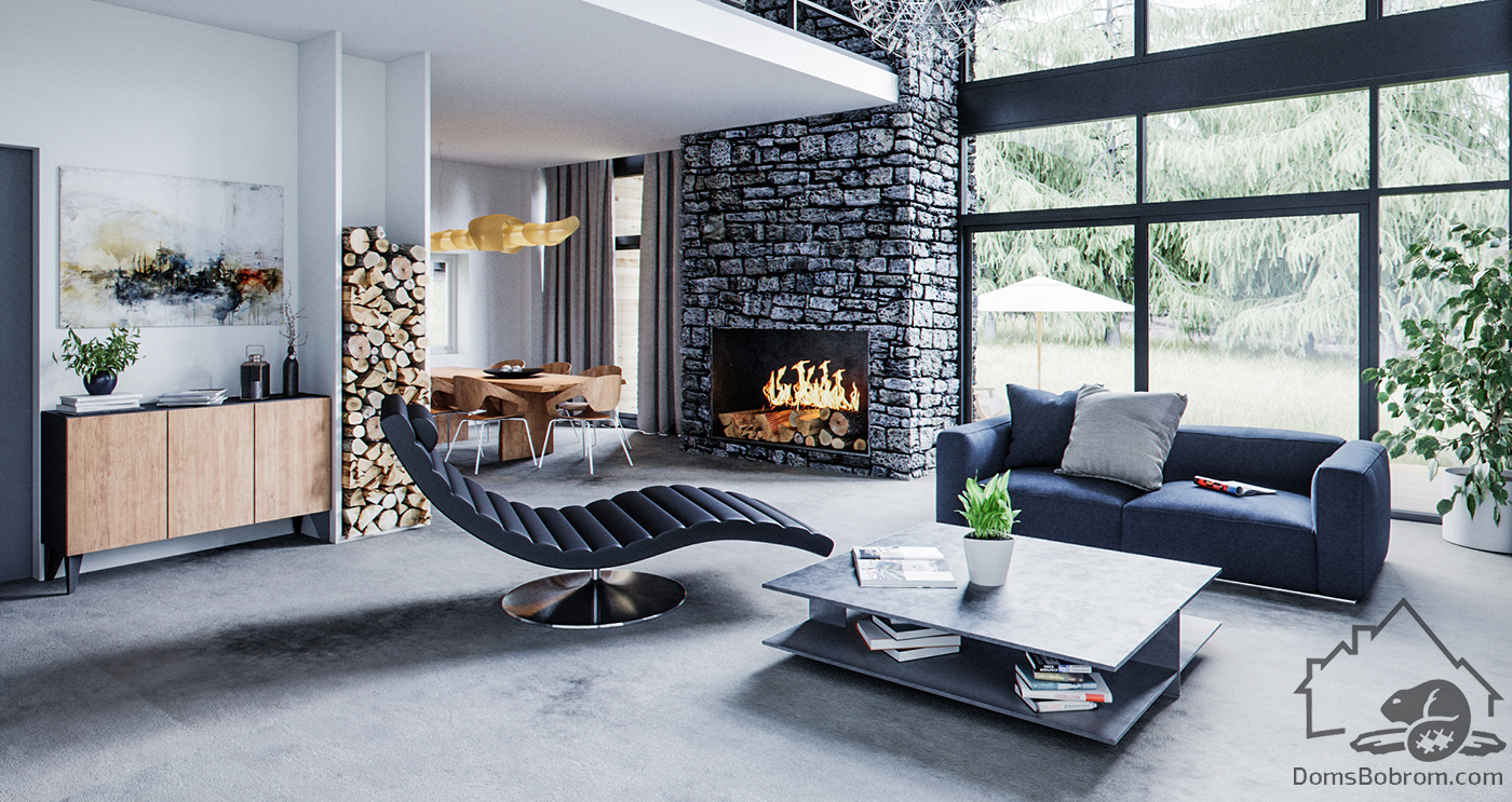 Остекленная панорамная стена в гостиной прекрасно освещает интерьер и гарантирует отличный вид из окна. Камин по передней стене дома создает уют и делает интерьер необычным. Второй свет делает пространство целостным и светлым. На мансардном этаже расположено 3 спальни, оттуда открывается прекрасный вид на окрестности.