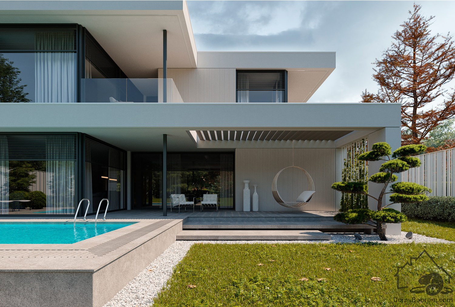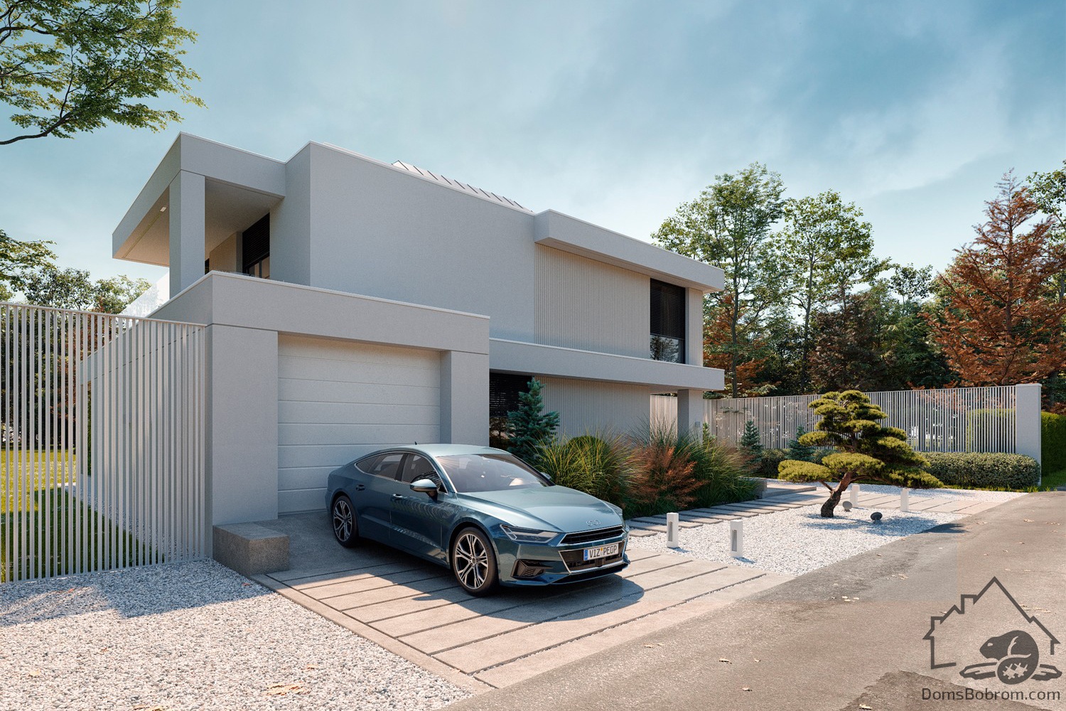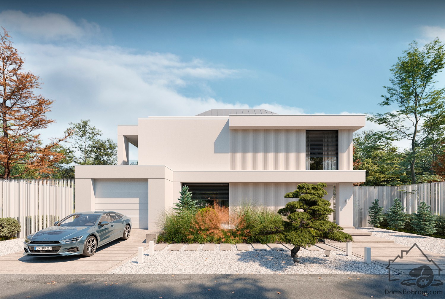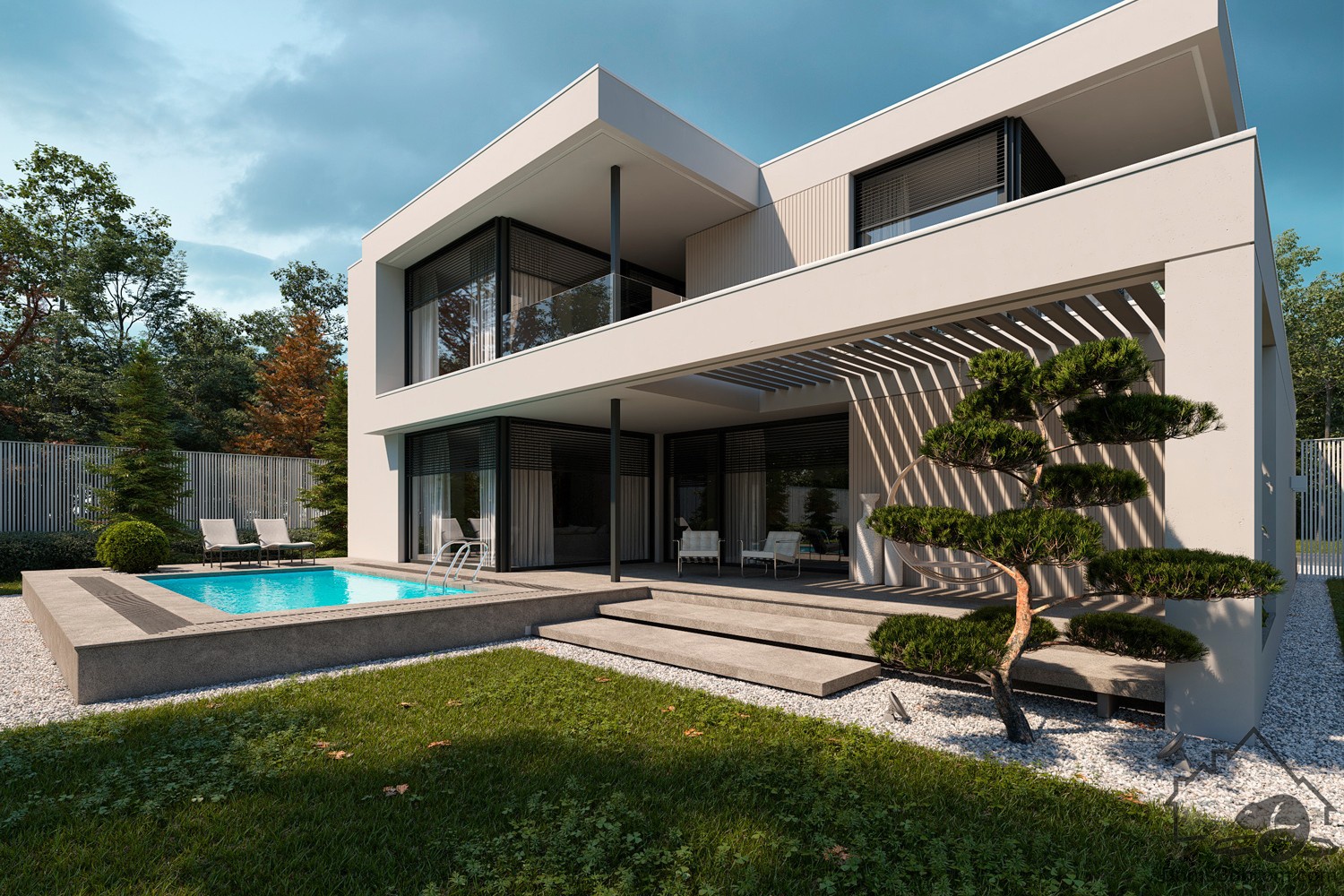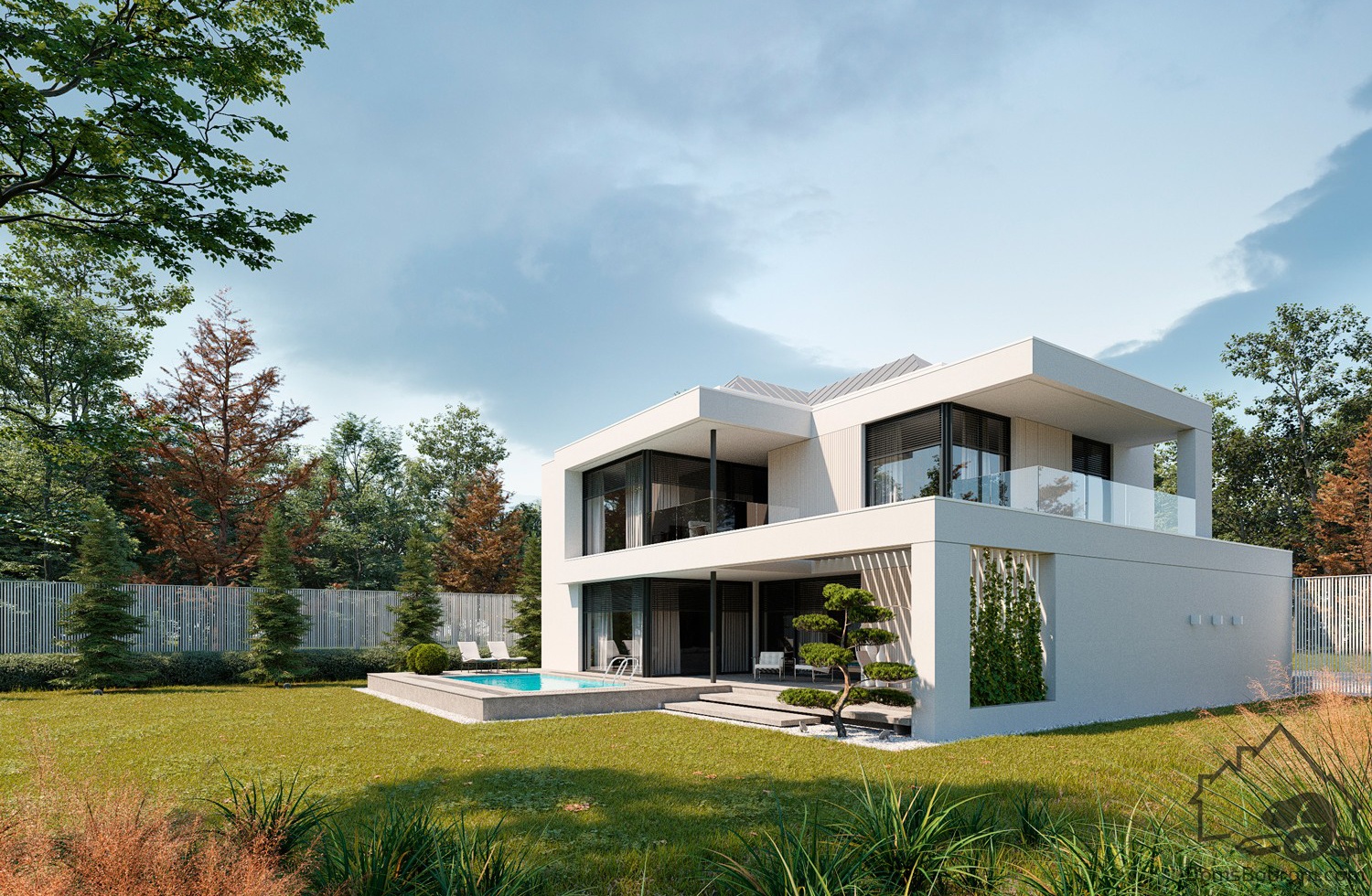 Дом Sintia - это проект двухэтажного дома в современном стиле. Такой дом обеспечит очень высокий уровень жизни и комфорта семье. Дом очень вместительный, функциональный. На первом этаже находятся общие помещения и гараж, а второй отведен под приватную зону спален. Плоскую крышу можно также сделать используемой.