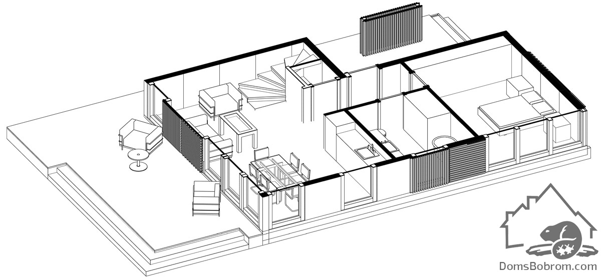 - Каркас:Каркас дома из сухой строганой доски камерной сушки: силовой каркас, хедеры, ригеля, обвязки каркаса, стропильная система, перекрытия, перегородки.