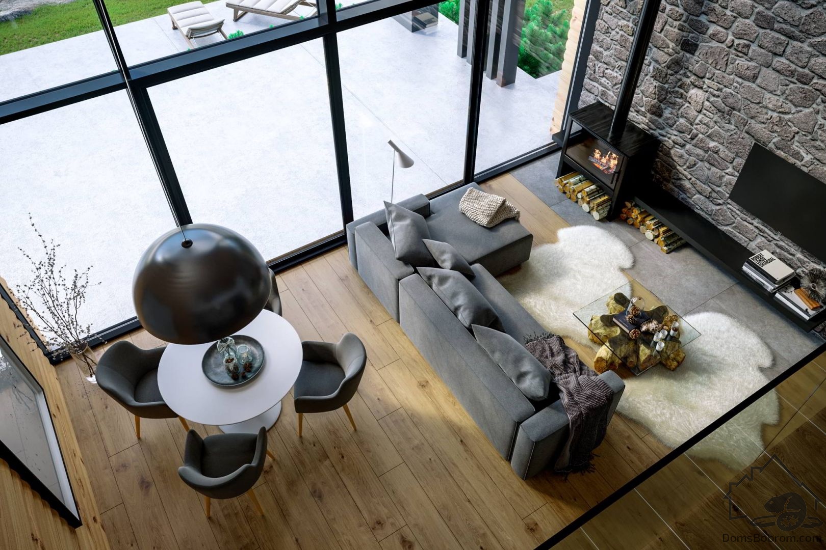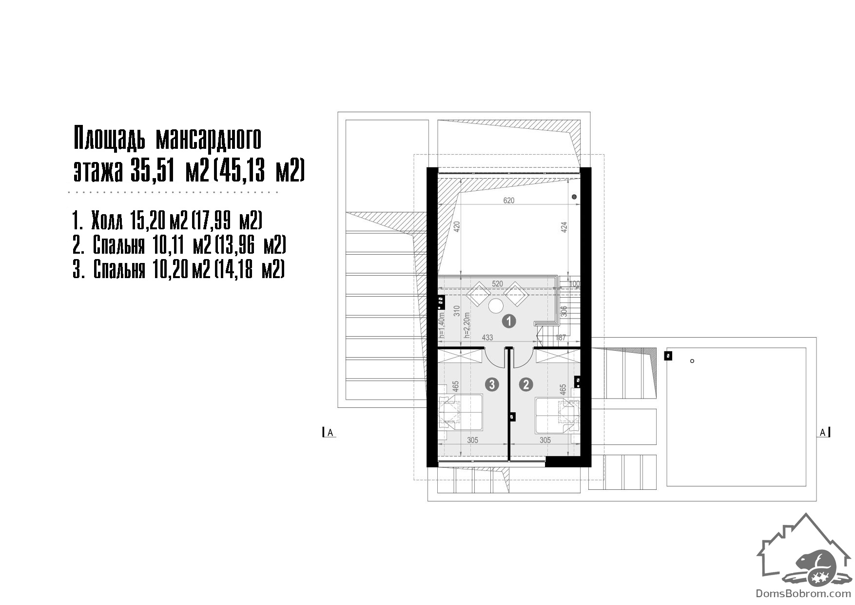 На мансардном этаже небольшая уютная зона отдыха с прекрасным видом на окрестности и две комфортабельные спальни с панорамным остеклением.