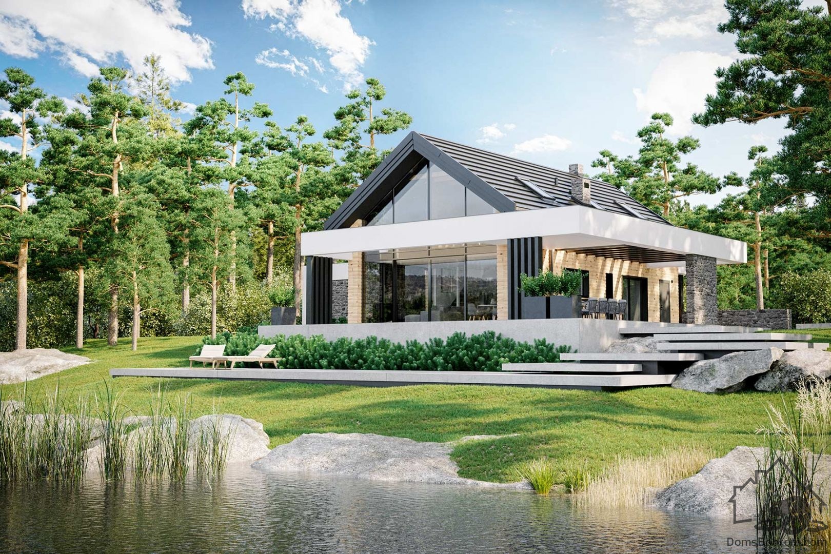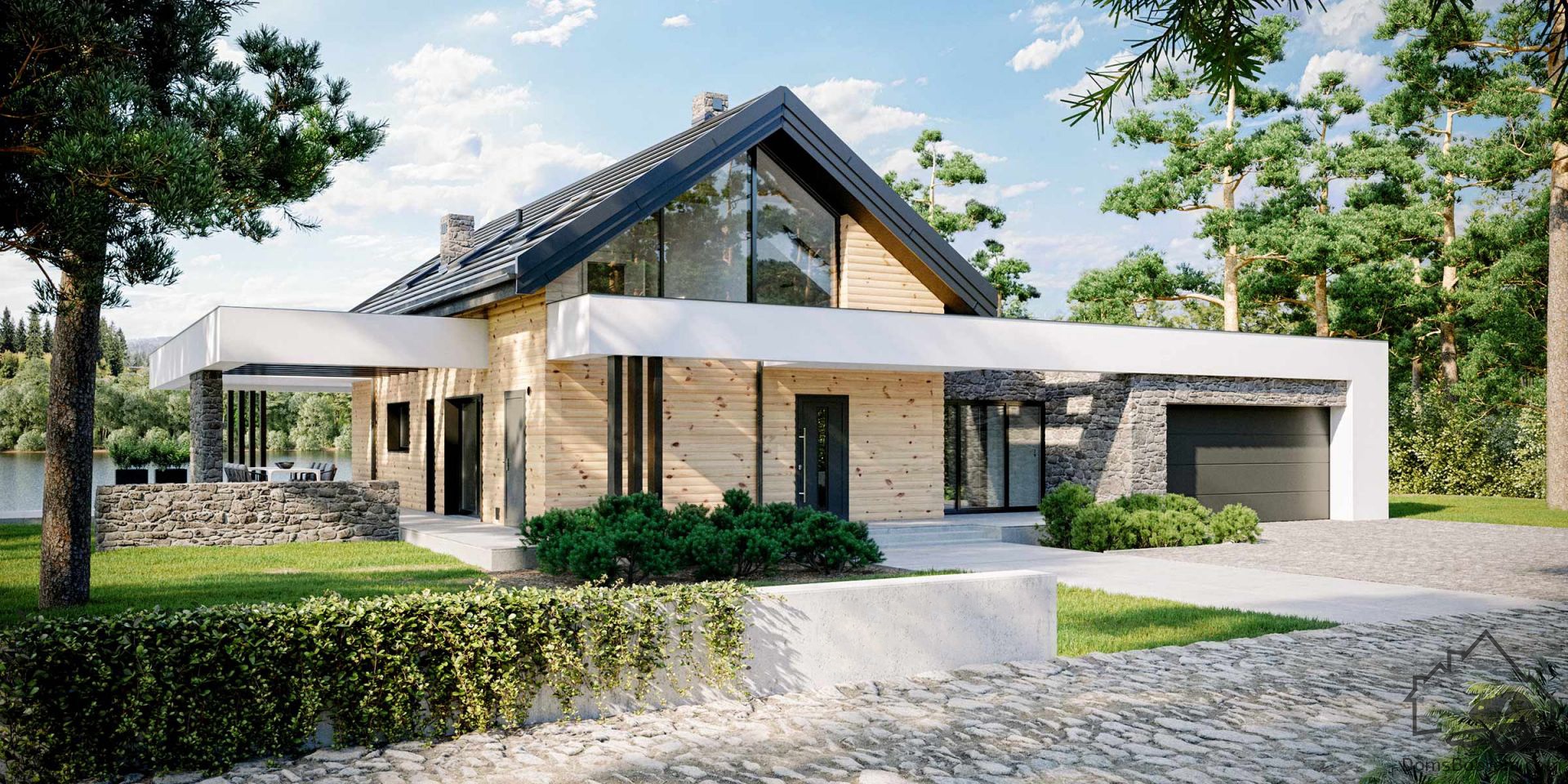 Внешний дизайн дома Statek - отличное предложение для любителей современной архитектуры, а также классных, уютных интерьеров. Корпус простой и компактный, облицован плоской плиткой и отделан натуральными материалами. Белый антаблемент, окружающий здание, контрастирует с деревянным и каменным фасадом, что придает теплоту и уют всему облику дома.