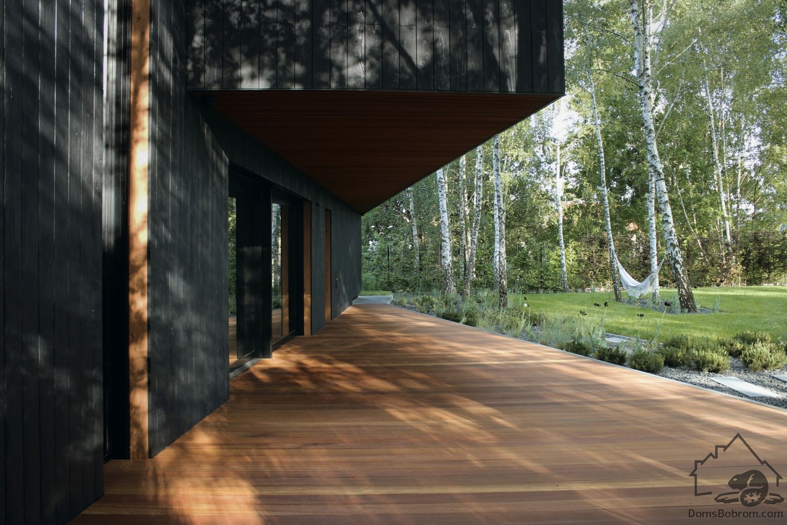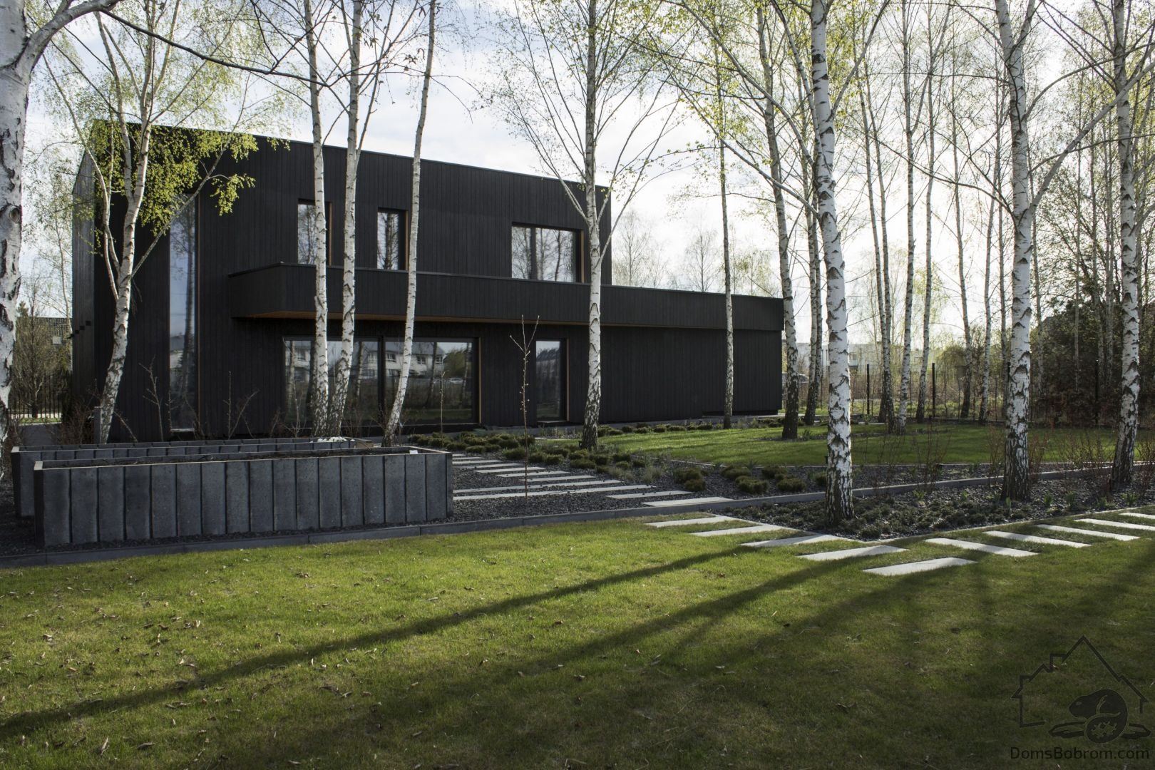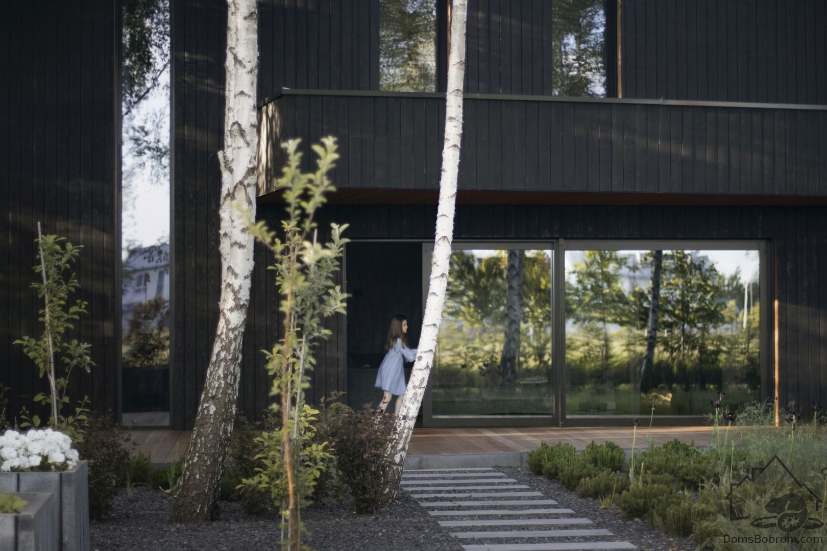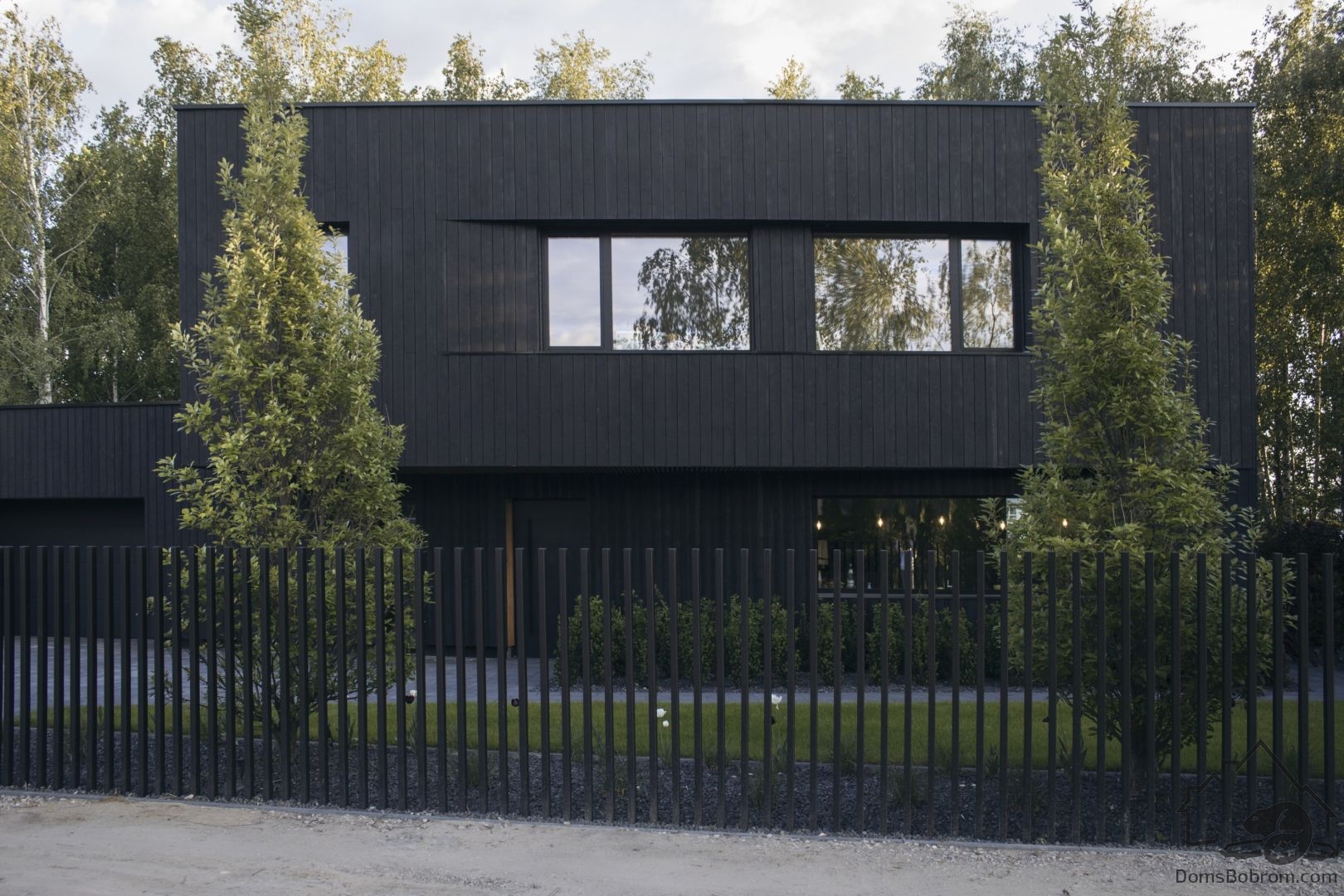 Дом Талдом - это дом для семьи с двумя детьми. Современная архитектурная форма с панорамным остеклением выходит на сад. Характерным элементом дома является высокое окно высотой более 5 метров, через которое в столовую проникает свет с южной стороны. Фасад полностью выполнен в старинной японской технике Shou Sugi Ban - консервации древесины путем обжига. На фоне черного цвета фасада белые березы становятся ярким акцентом.