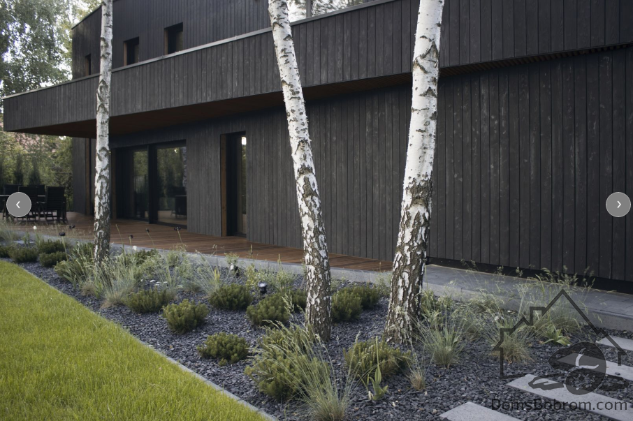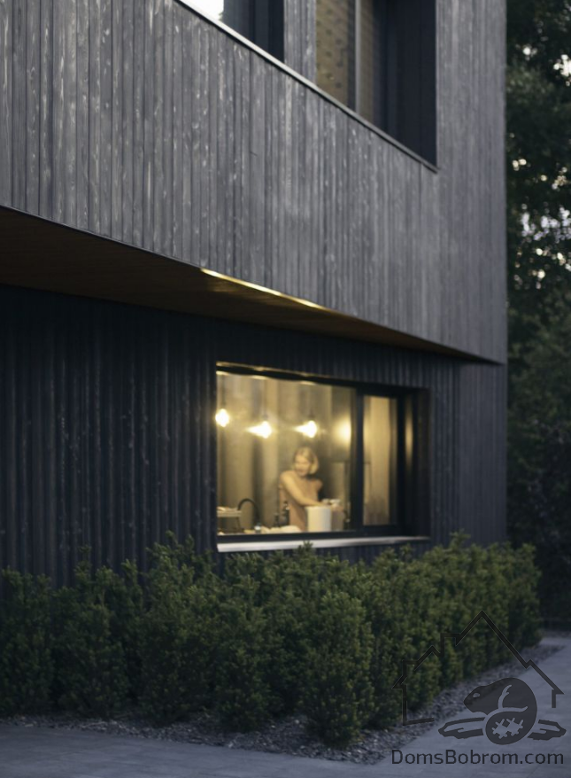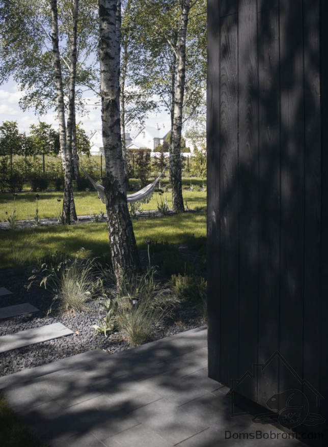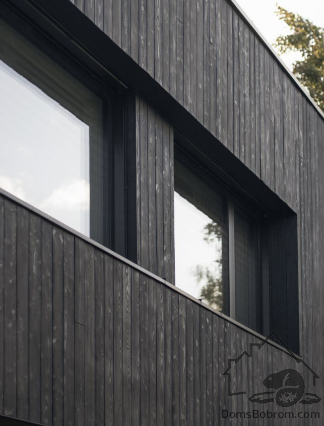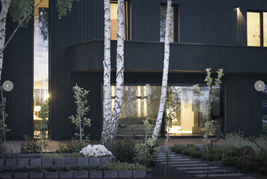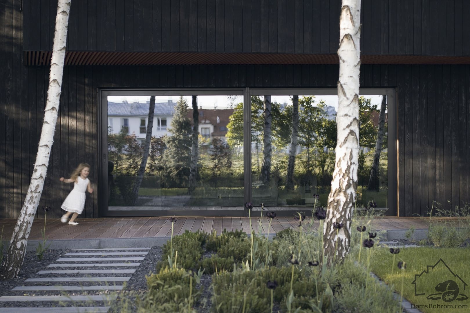 Дом Талдом - это дом для семьи с двумя детьми. Современная архитектурная форма с панорамным остеклением выходит на сад. Характерным элементом дома является высокое окно высотой более 5 метров, через которое в столовую проникает свет с южной стороны. Фасад полностью выполнен в старинной японской технике Shou Sugi Ban - консервации древесины путем обжига. На фоне черного цвета фасада белые березы становятся ярким акцентом.