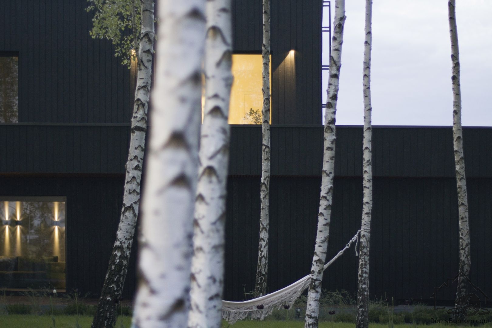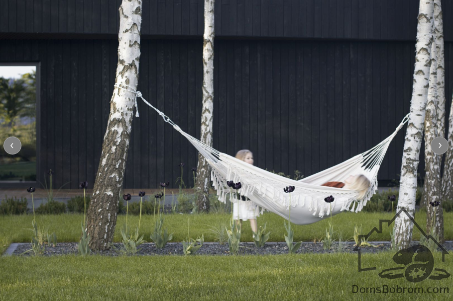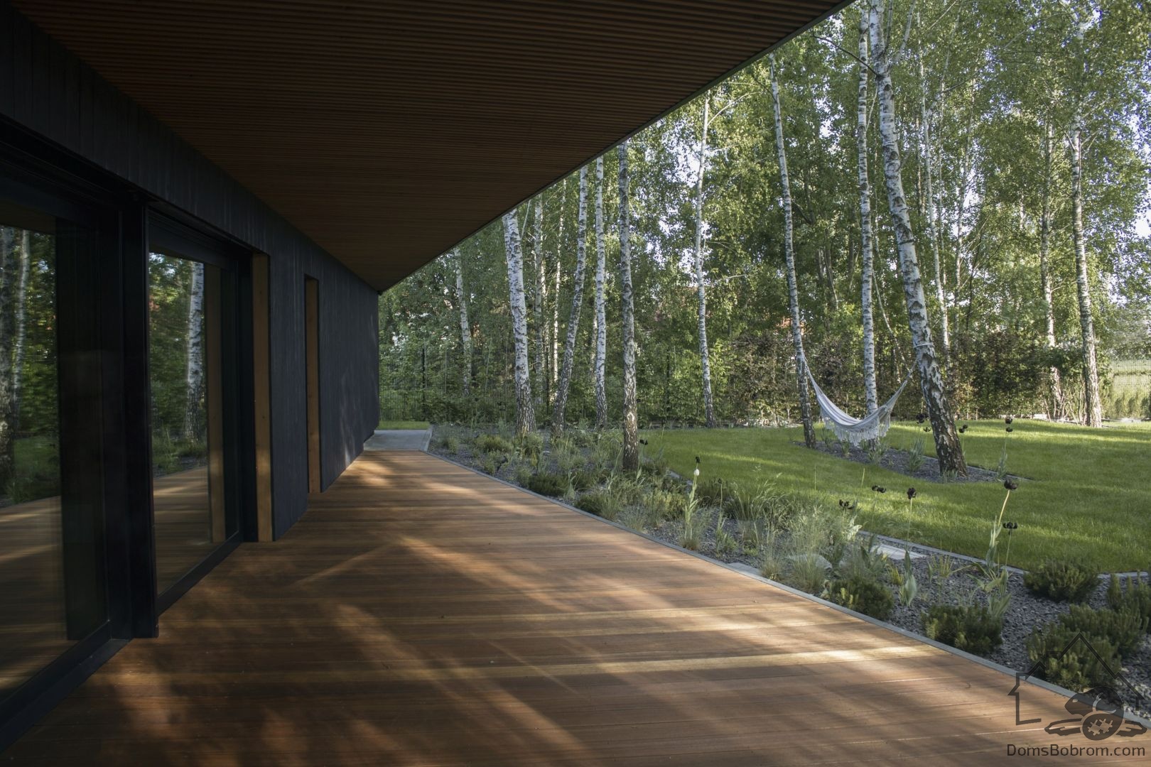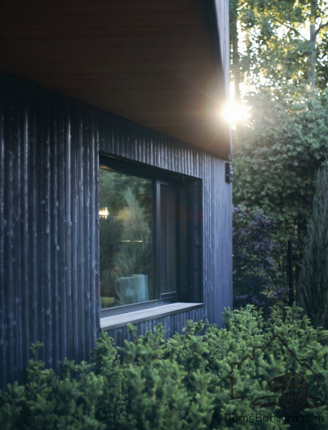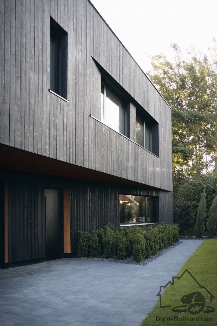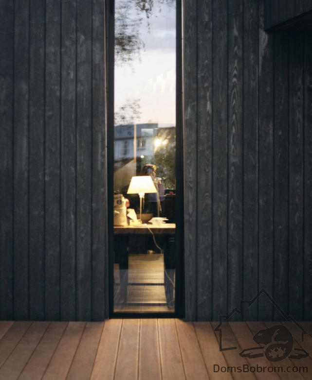 Дом Талдом - это дом для семьи с двумя детьми. Современная архитектурная форма с панорамным остеклением выходит на сад. Характерным элементом дома является высокое окно высотой более 5 метров, через которое в столовую проникает свет с южной стороны. Фасад полностью выполнен в старинной японской технике Shou Sugi Ban - консервации древесины путем обжига. На фоне черного цвета фасада белые березы становятся ярким акцентом.