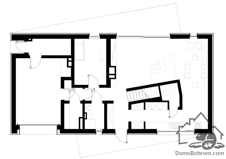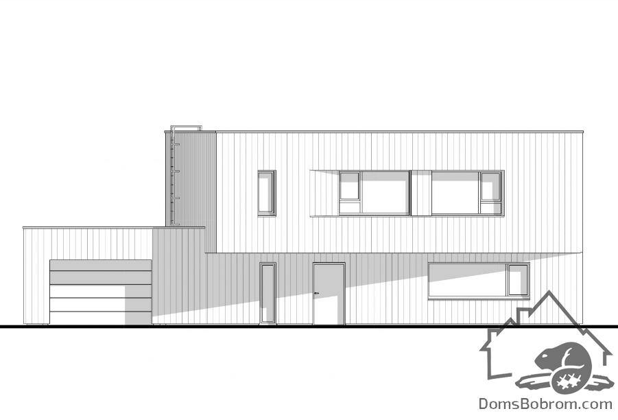 В северной части от входа на участок расположена кухня и две спальни, а в южной части - гостиная, столовая и еще она спальня. Обширное остекление гостиной функционально и визуально связывает ее с садом. В центральной части дома есть лестница, отделяющая кухню от гостиной. С первого этажа открывается вид на высокую столовую.