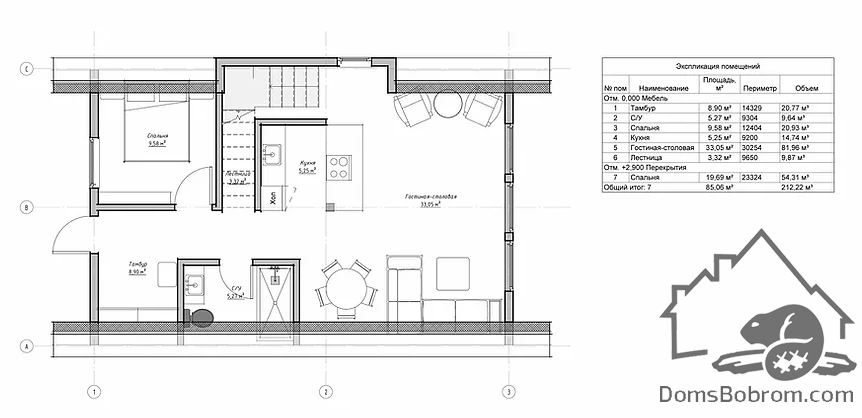 - Каркас:Каркас дома из сухой строганой доски камерной сушки: силовой каркас, хедеры, ригеля, обвязки каркаса, стропильная система, перекрытия, перегородки.