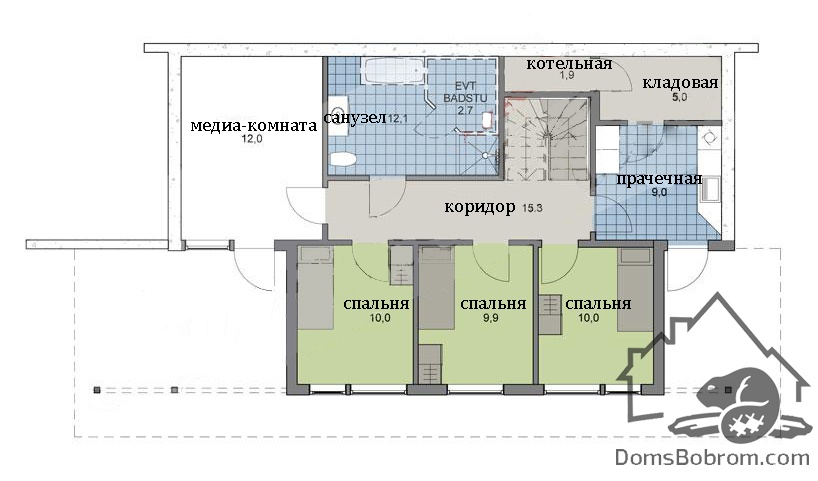 На первом этаже расположены 3 просторные спальни, большая ванная комната и подсобное помещение с выходной дверью, а также медиа-комната, которую можно сделать спальней.