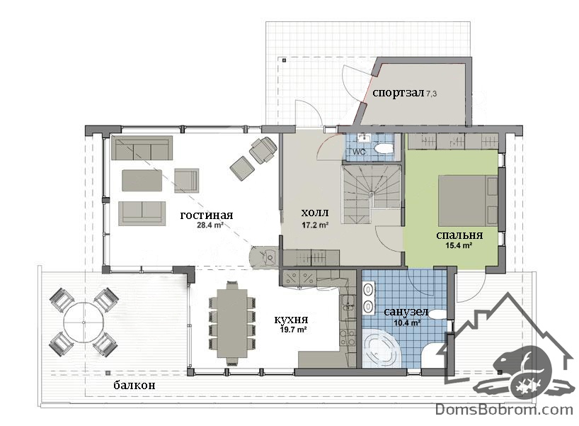 В просторной главной спальне есть хороший гардероб, собственная ванная комната и прямой выход на балкон. Гостиная на втором этаже имеет наклонные потолки, которые создают ощущение простора и воздуха.