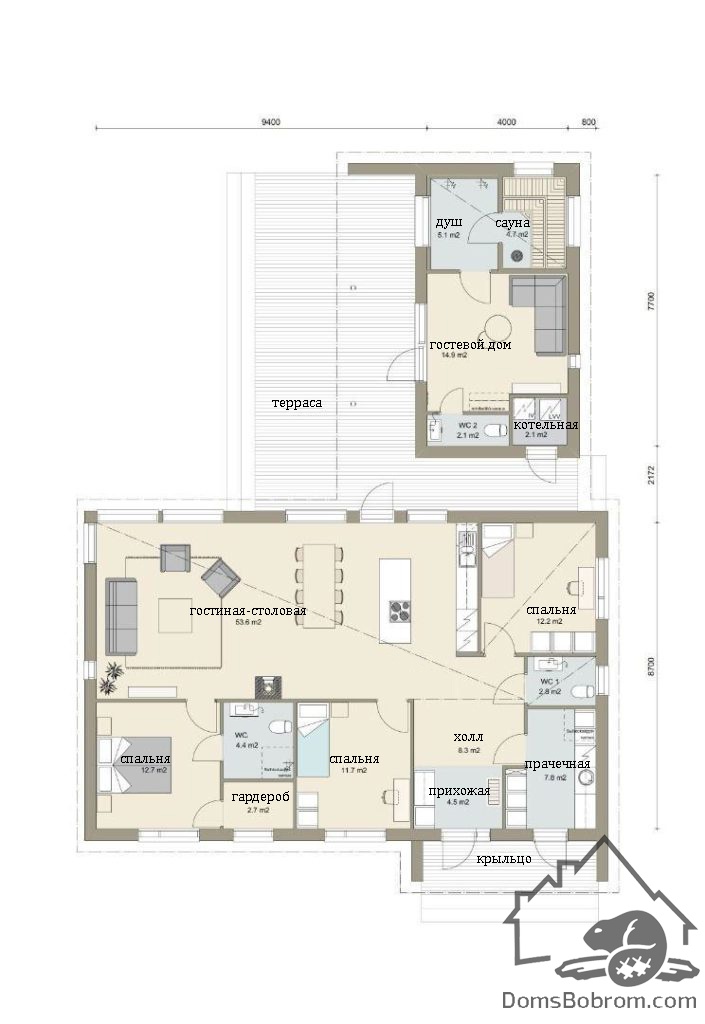 Дом Vieras - это дом для тех, кто любит отдых за городом, сауну и принимать гостей. Планировка дома гибкая, количество и расположение комнат может быть практически любым. Просторная гостиная вместит всех. Во втором корпусе вместо сауны можно организовать гостевой дом.