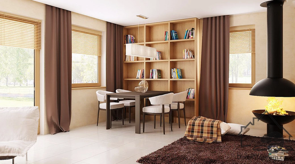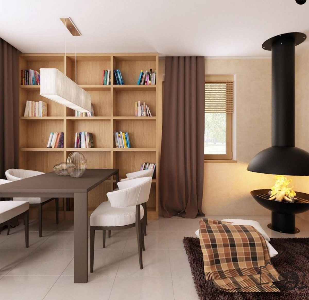 На первом этаже дома размещается большая гостиная совмещенная со столовой. В гостиной предусмотрен камин, который придает дополнительный уют дому. Просторная кухня имеет правильную форму, что дает возможность удобно разместить в ней всю необходимую кухонную технику.