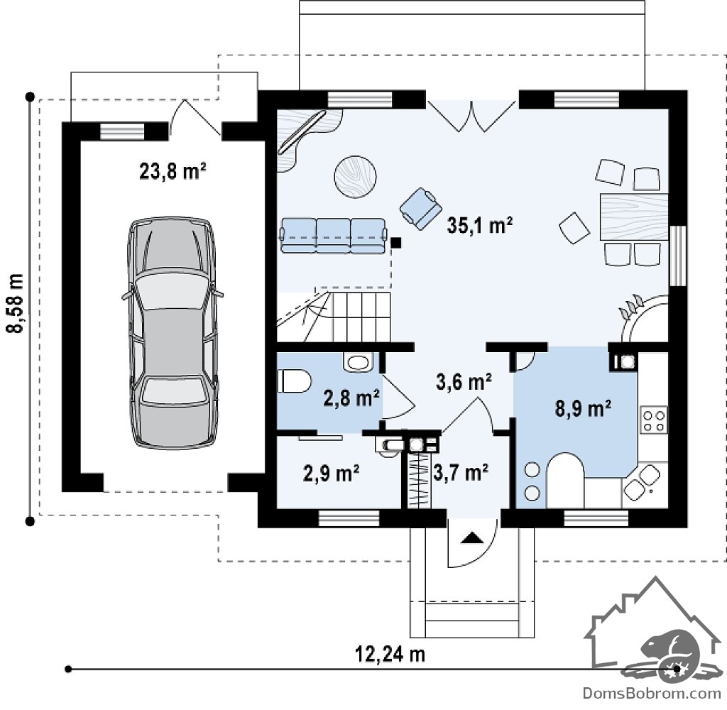 Дом Вялки - это компактный двухэтажный дом с гаражом, который вмещает один автомобиль.