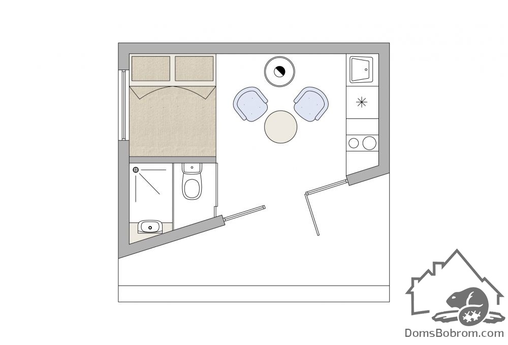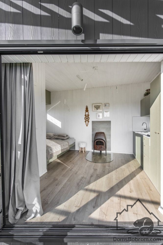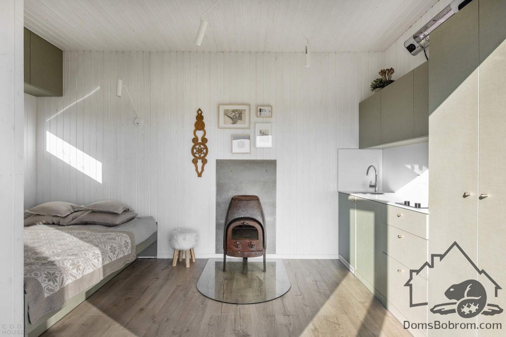 Кровать «queen size» установлена в нише, а под ней расположена еще одна, выкатная. В доме также разместили маленькую, но полностью оборудованную, кухню и санузел с довольно просторной душевой кабиной. Условной границей между спальной зоной и кухней служит обеденная группа с круглым столиком и парой стульев. Рядом, у стены установлена дровяная печь-камин.