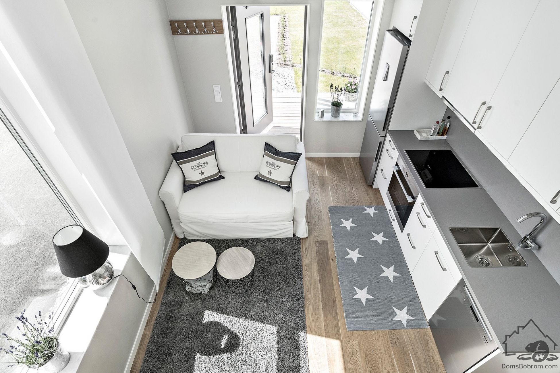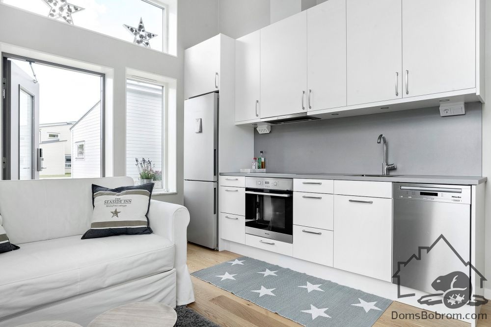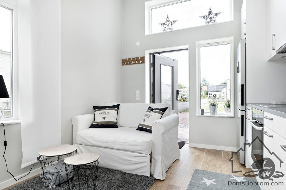 Отделка и интерьер дома предельно лаконичны. Окрашенные в белый цвет стены, простая белая мебель, светлый деревянный пол — все это работает на визуальное расширение пространства.