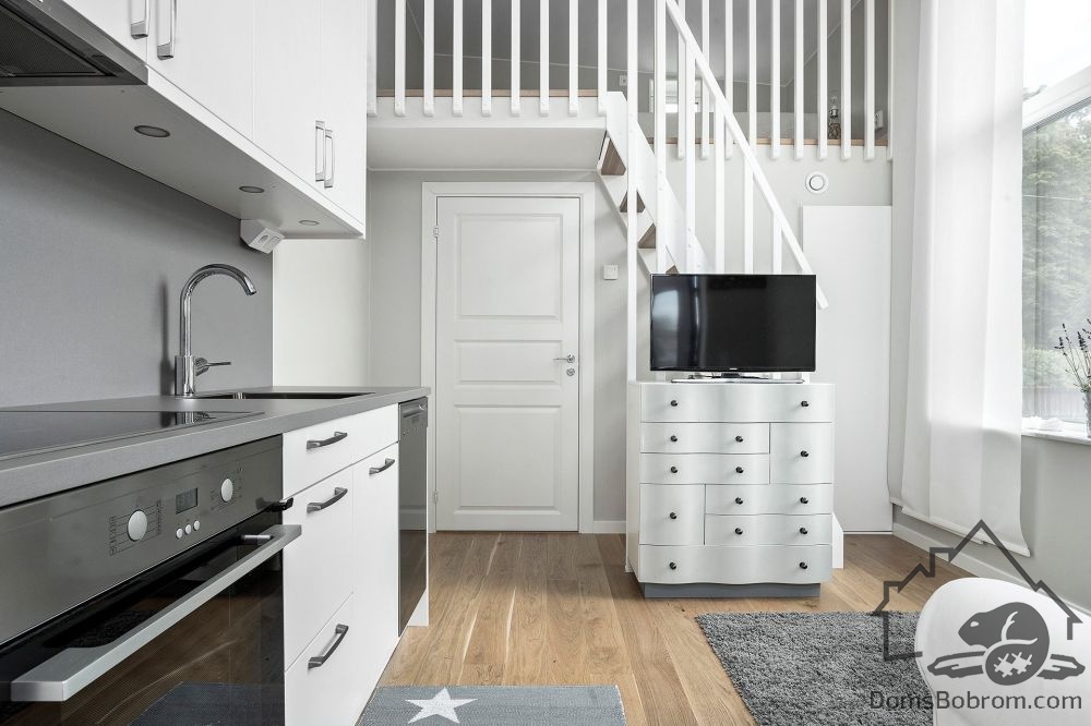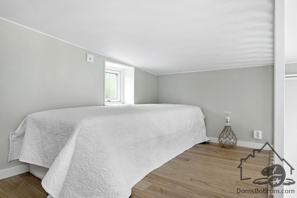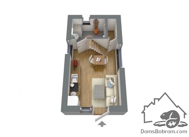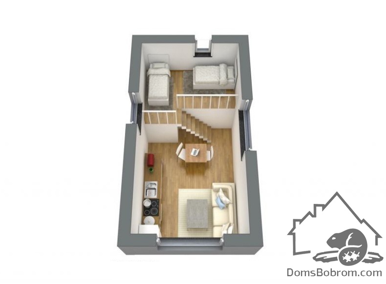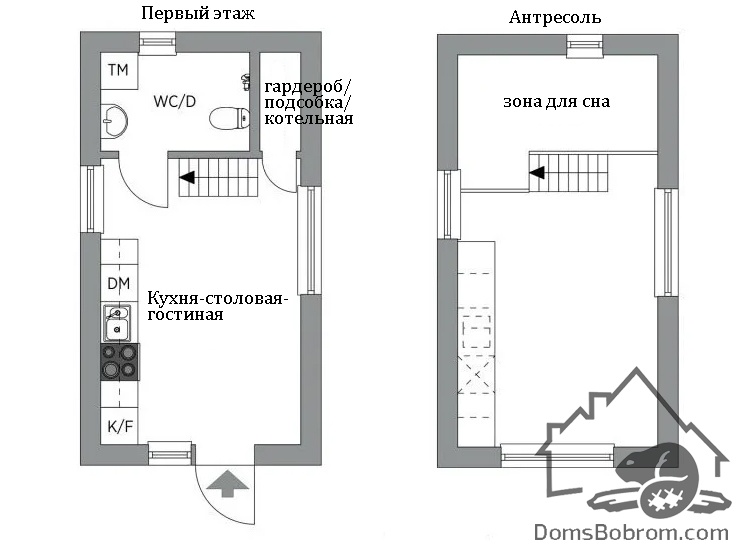 Дом Grey - это маленькая каркасная дача с простой планировкой, спальней на антресоли и бюджетной стильной отделкой. Прямоугольное в плане здание с односкатной крышей обшито светло-серым сайдингом. Большую часть дома занимает объединенная кухня-гостиная. В изолированных помещениях обустроены ванная и гардероб (кладовая/котельная), над ними — антресоль со спальней.
