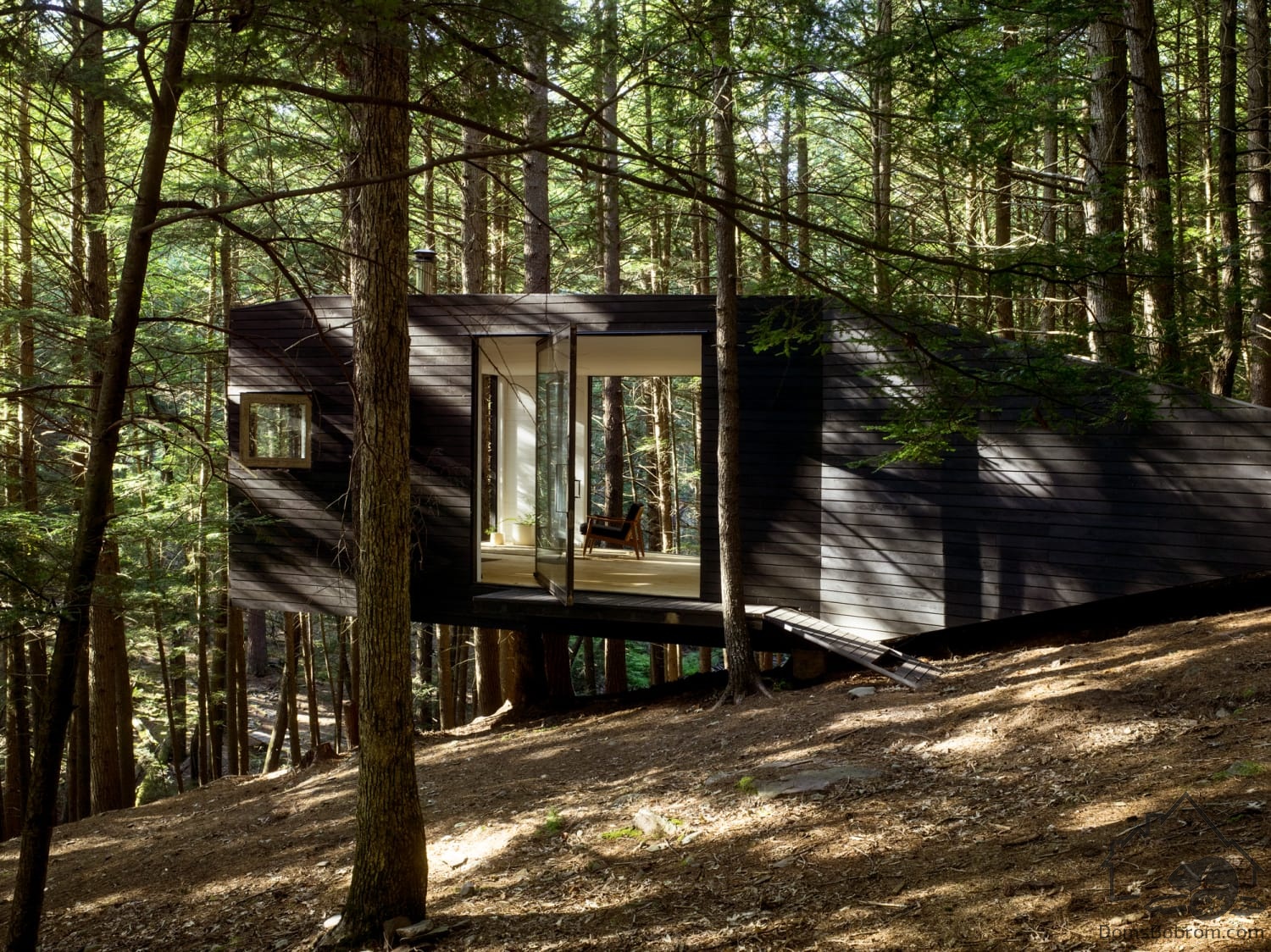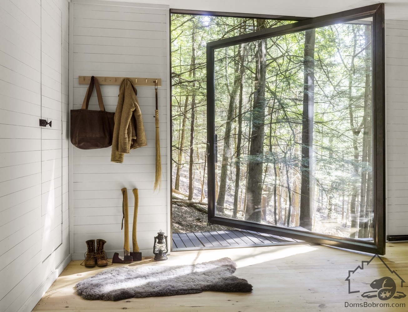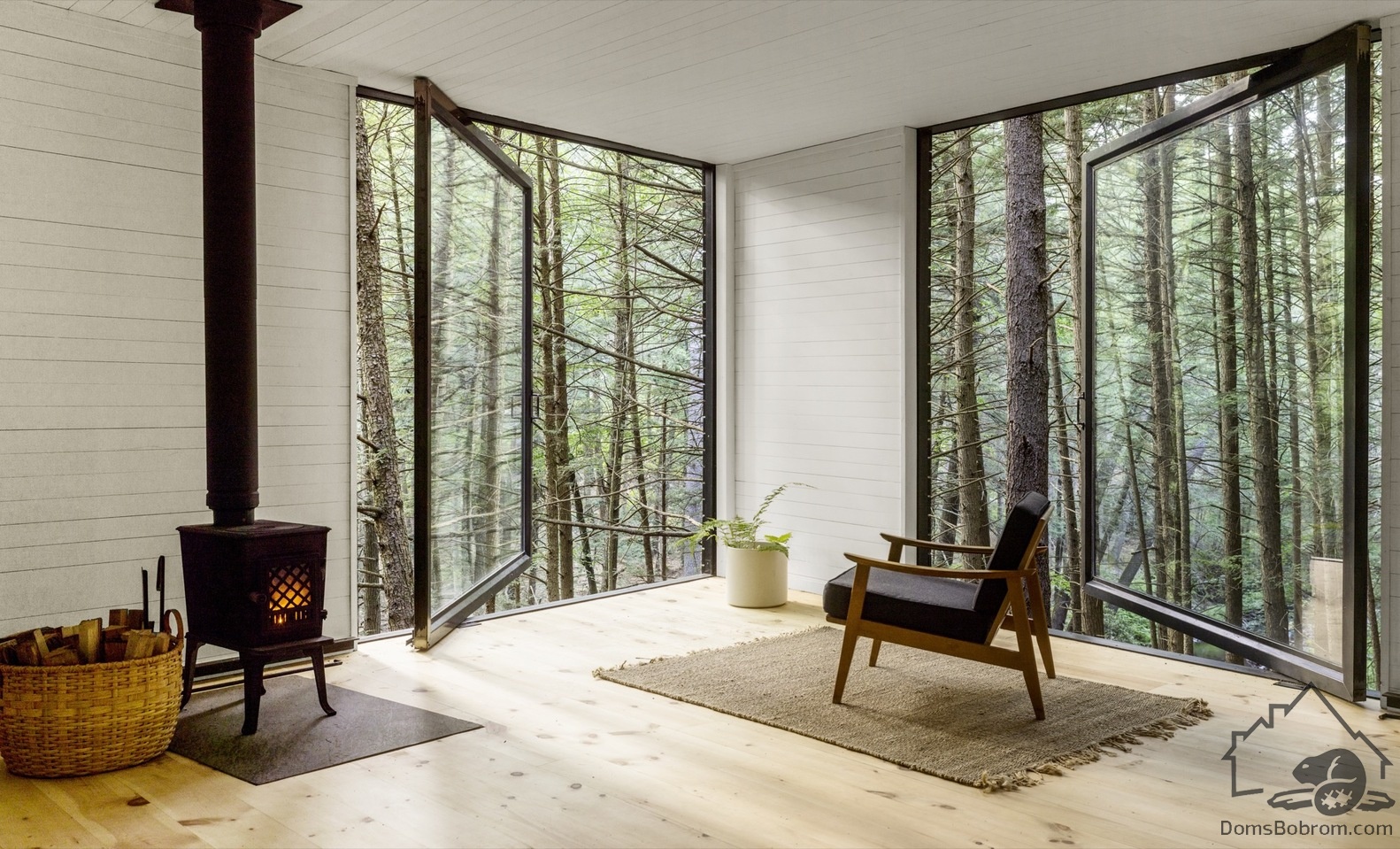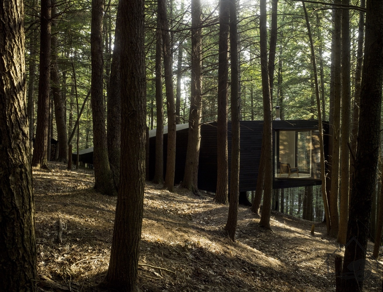 Фасад темного цвета позволяет незаметно интегрировать дом в лес. Стены внутри, наоборот, белые. Три окна во всю стену открывают пространство в лес и соединяют домик с природой.