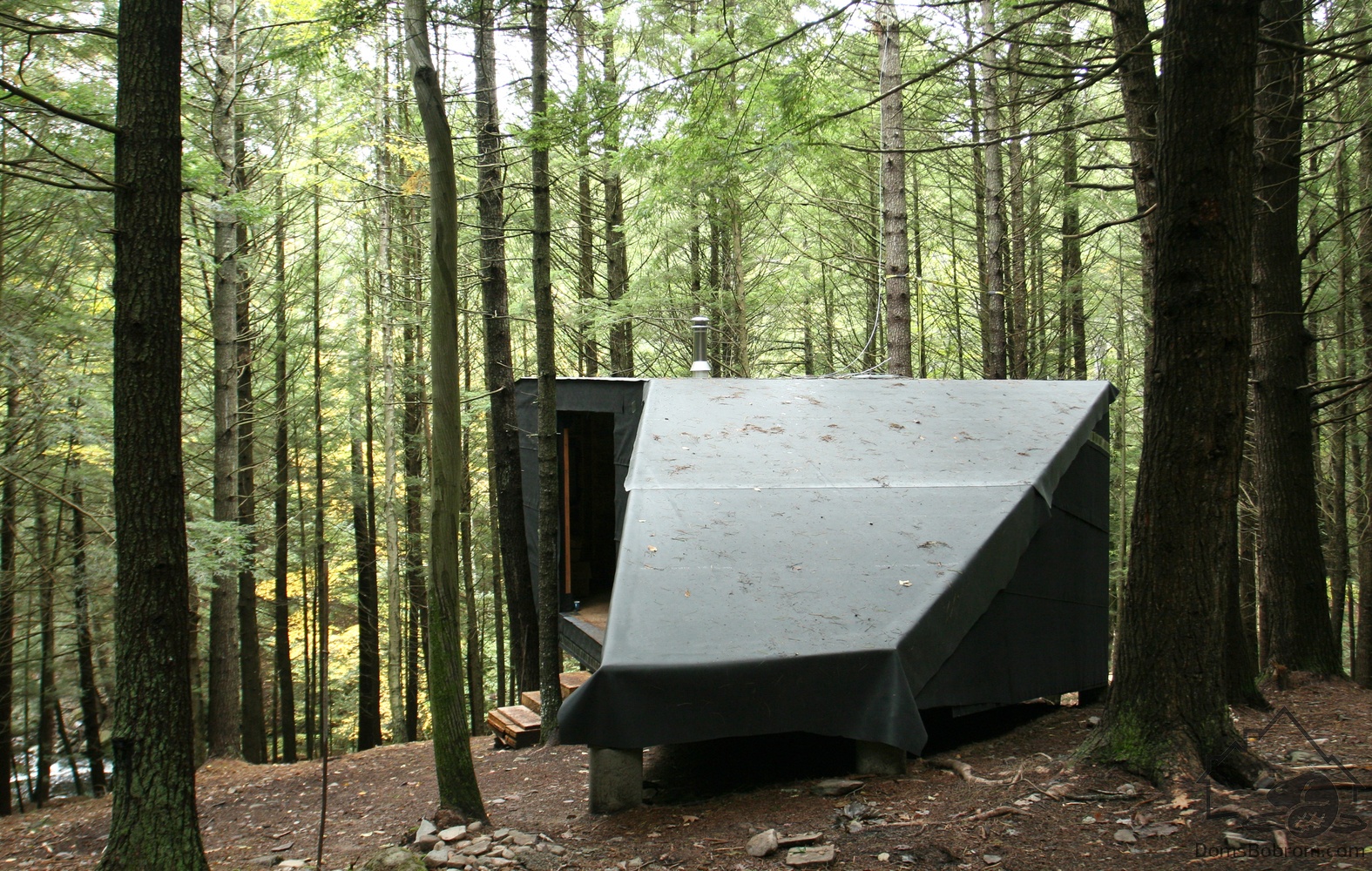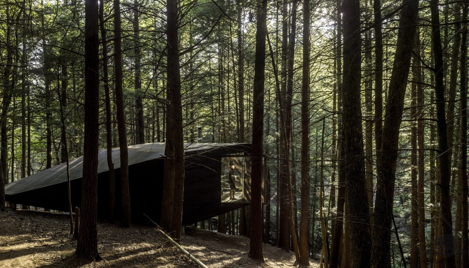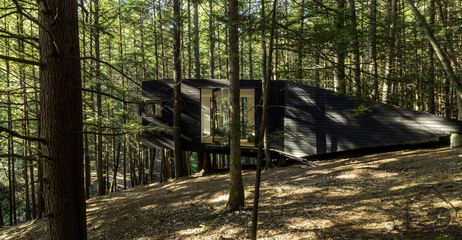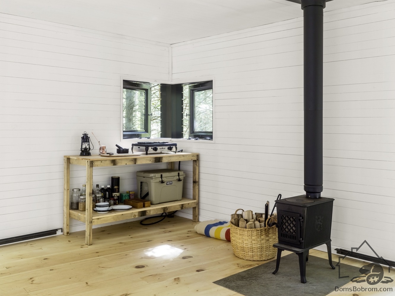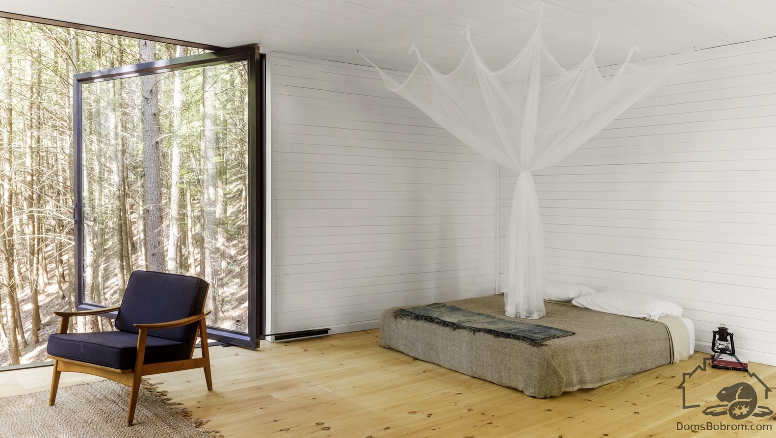 Фасад темного цвета позволяет незаметно интегрировать дом в лес. Стены внутри, наоборот, белые. Три окна во всю стену открывают пространство в лес и соединяют домик с природой.