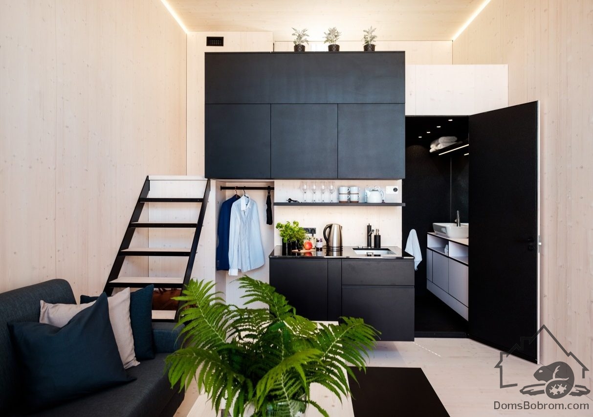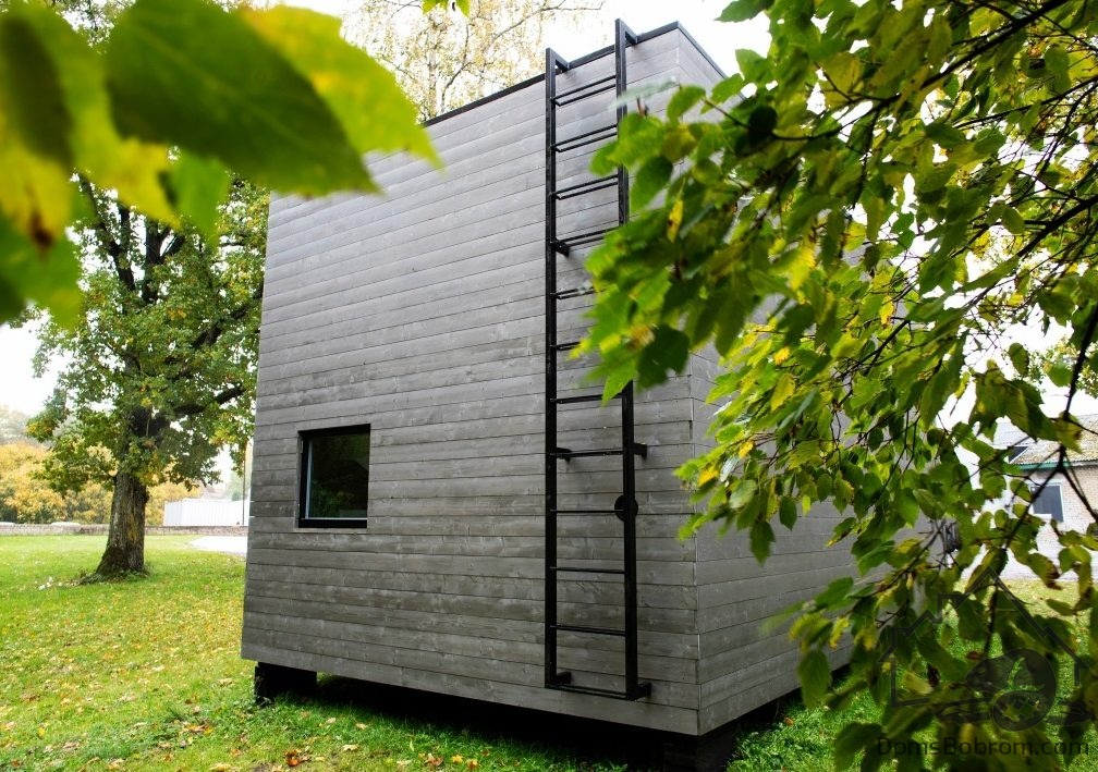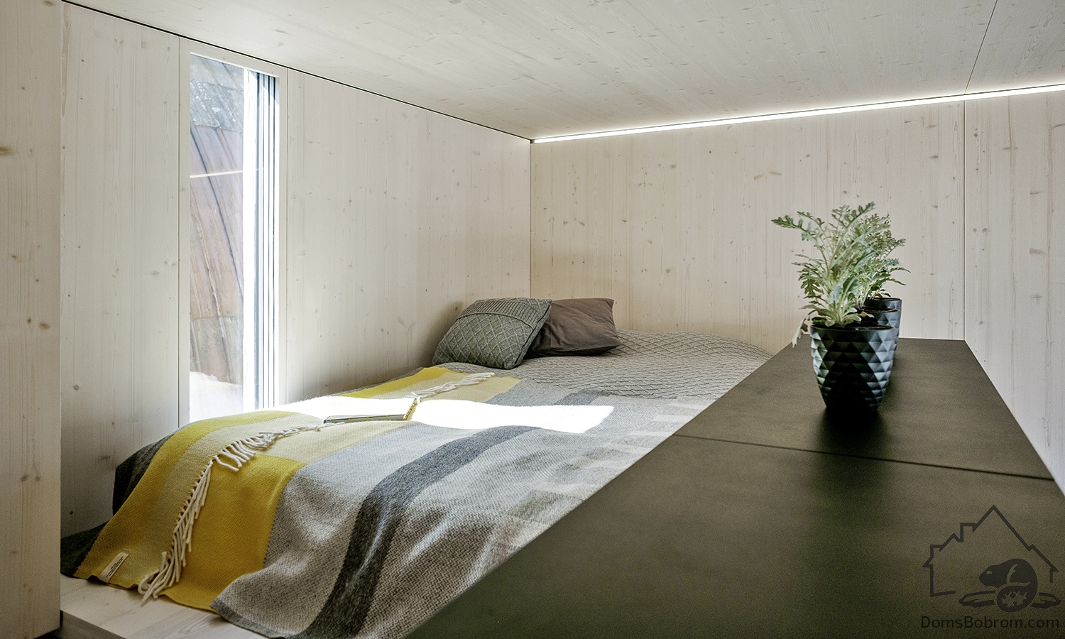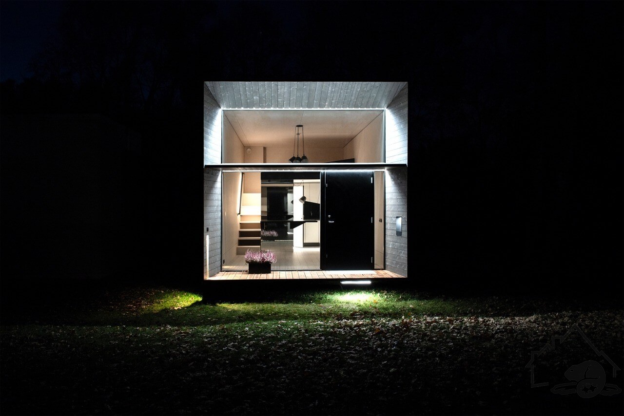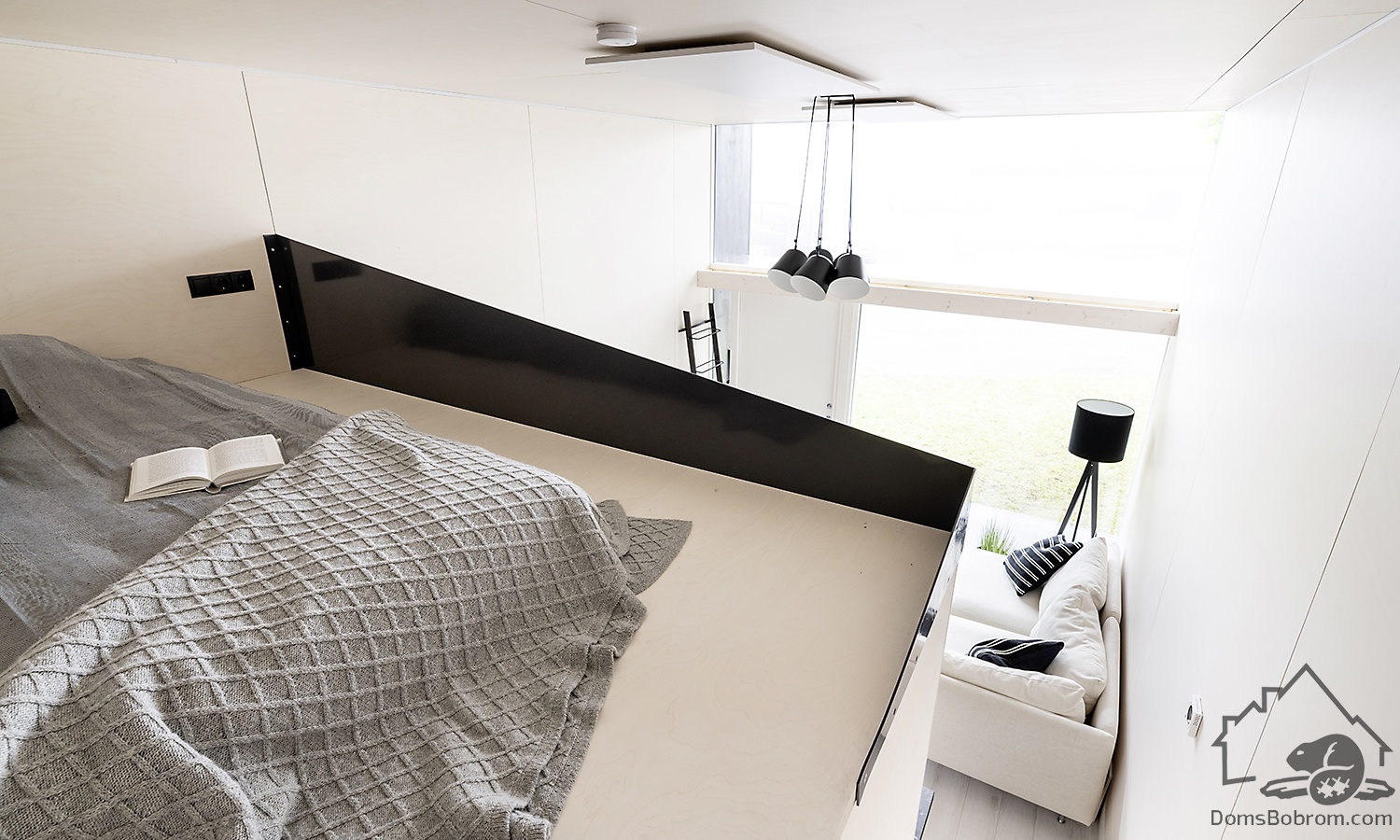 Этот мини-дом KODA 3.0 спроектирован в Эстонии компанией Kodasema. В нем несколько небольших окошек и один полностью застекленный фасад. Внутри домика есть все необходимое для комфортной жизни - санузел, полностью оборудованная кухня со шкафом-подсобкой, спальные места на антресоли и уютная зона гостиной со вторым светом.