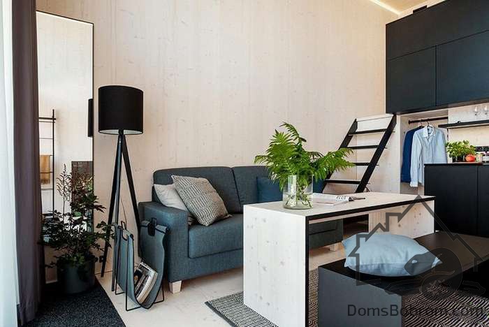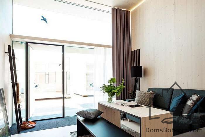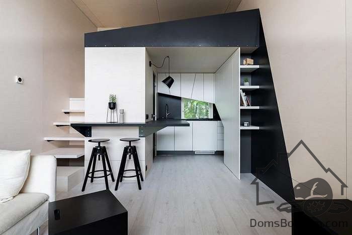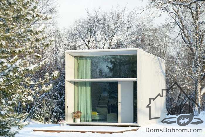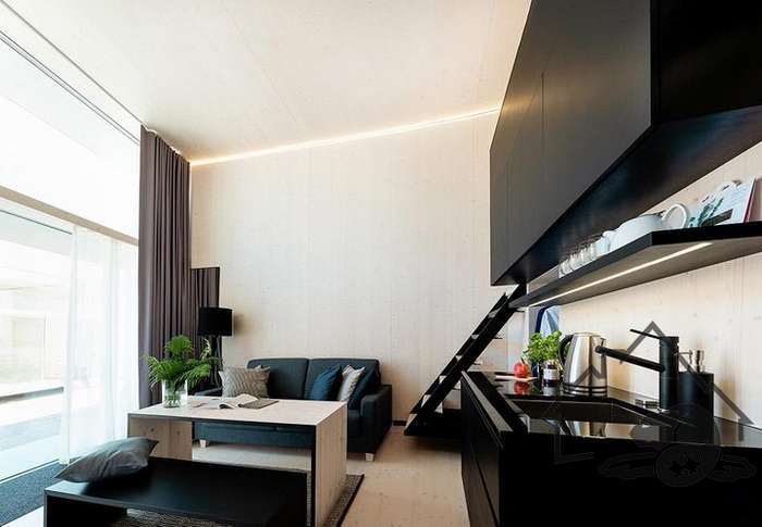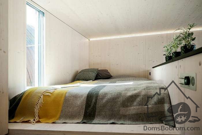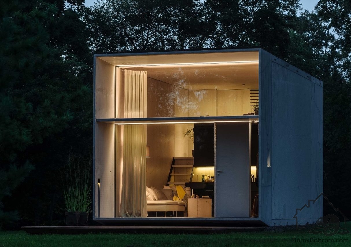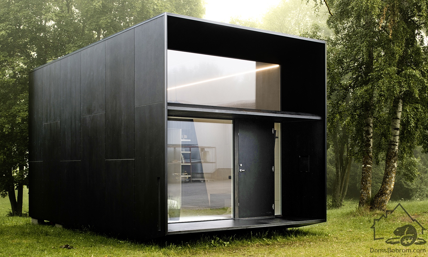 Этот мини-дом KODA 3.0 спроектирован в Эстонии компанией Kodasema. В нем несколько небольших окошек и один полностью застекленный фасад. Внутри домика есть все необходимое для комфортной жизни - санузел, полностью оборудованная кухня со шкафом-подсобкой, спальные места на антресоли и уютная зона гостиной со вторым светом.