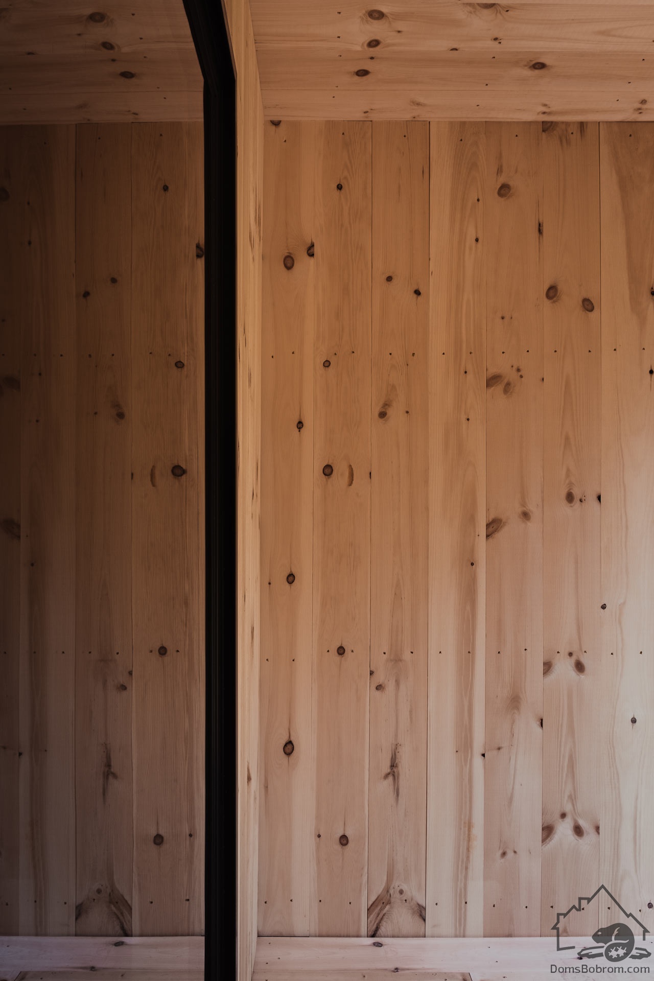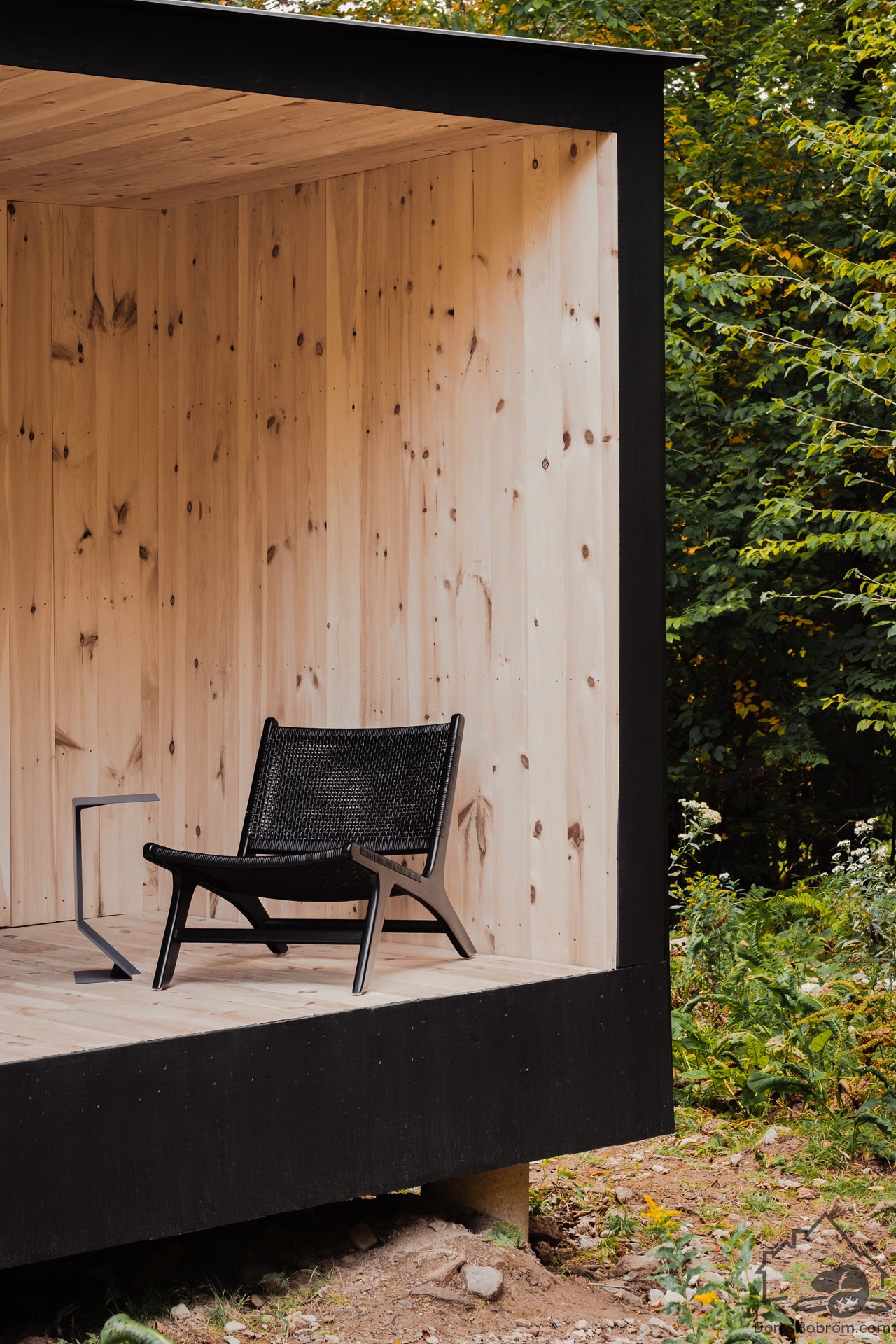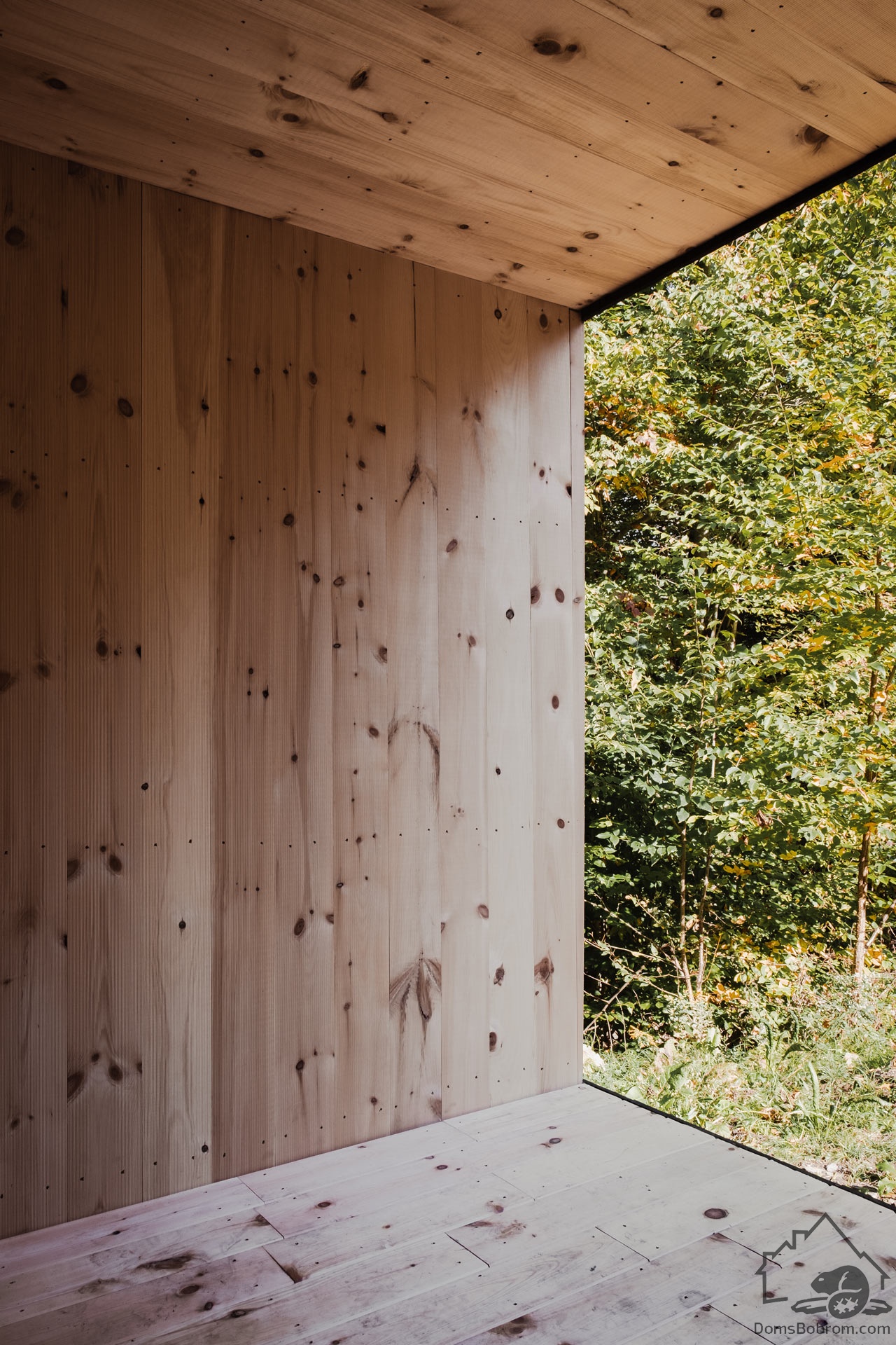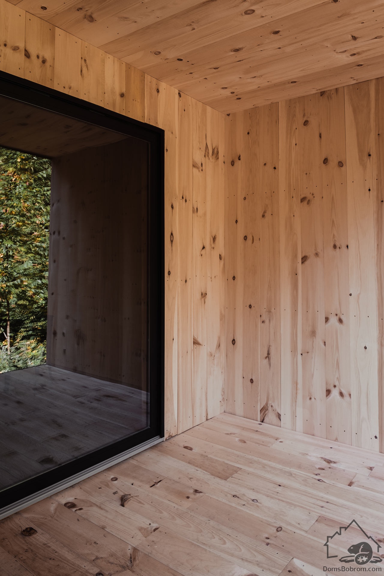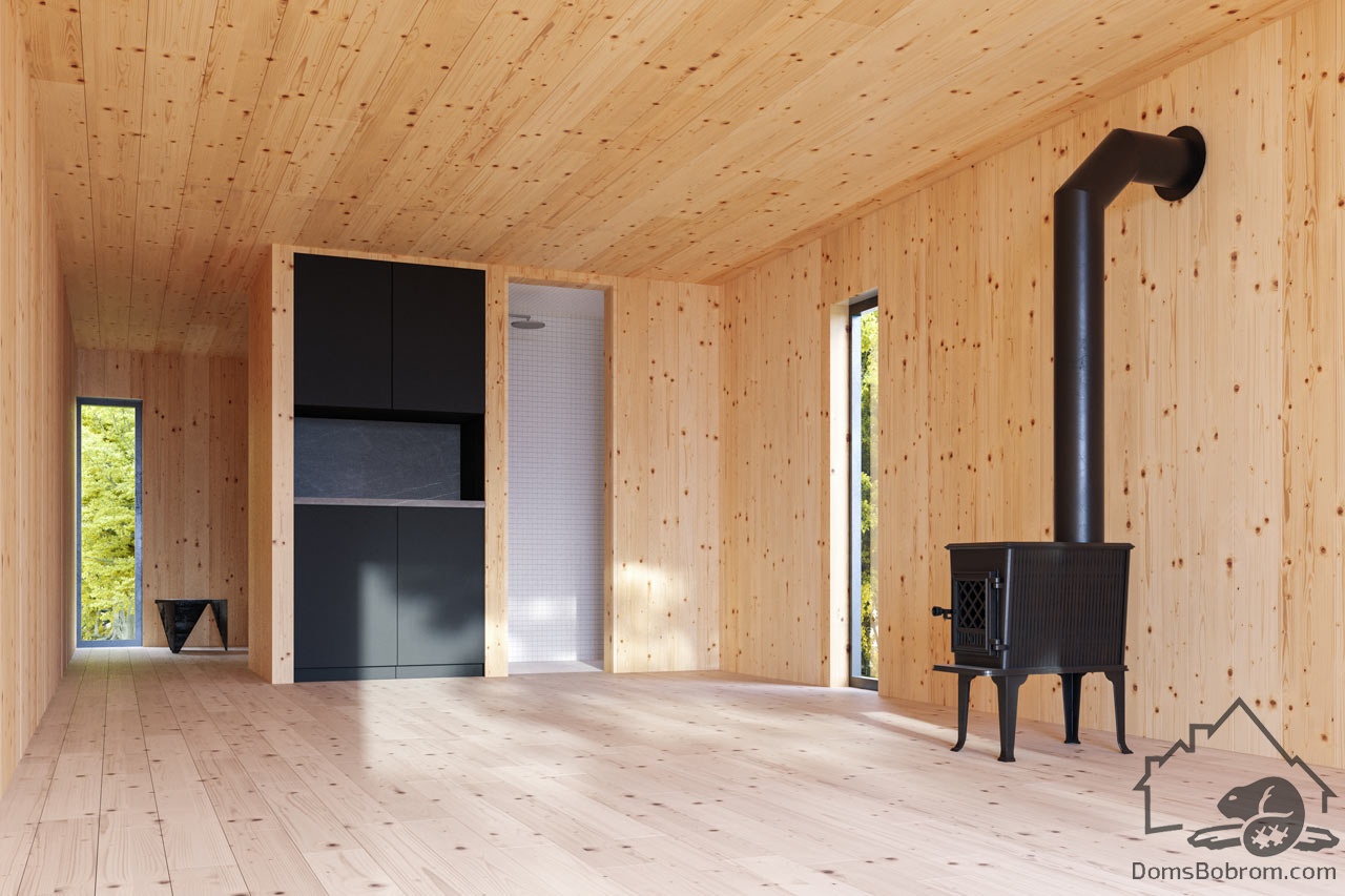 Внутри мини-дом Modest retreat разделен на четыре зоны – гостиную, кухню, столовую и спальню. Кухня и санузел находятся в центре дома. Небольшая дровяная печь обеспечивает тепло, а поперечная вентиляция сохраняет здание прохладным в жаркие дни.