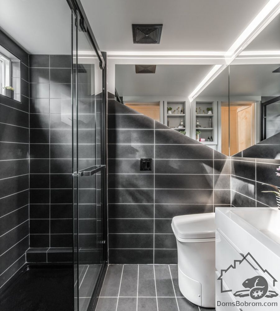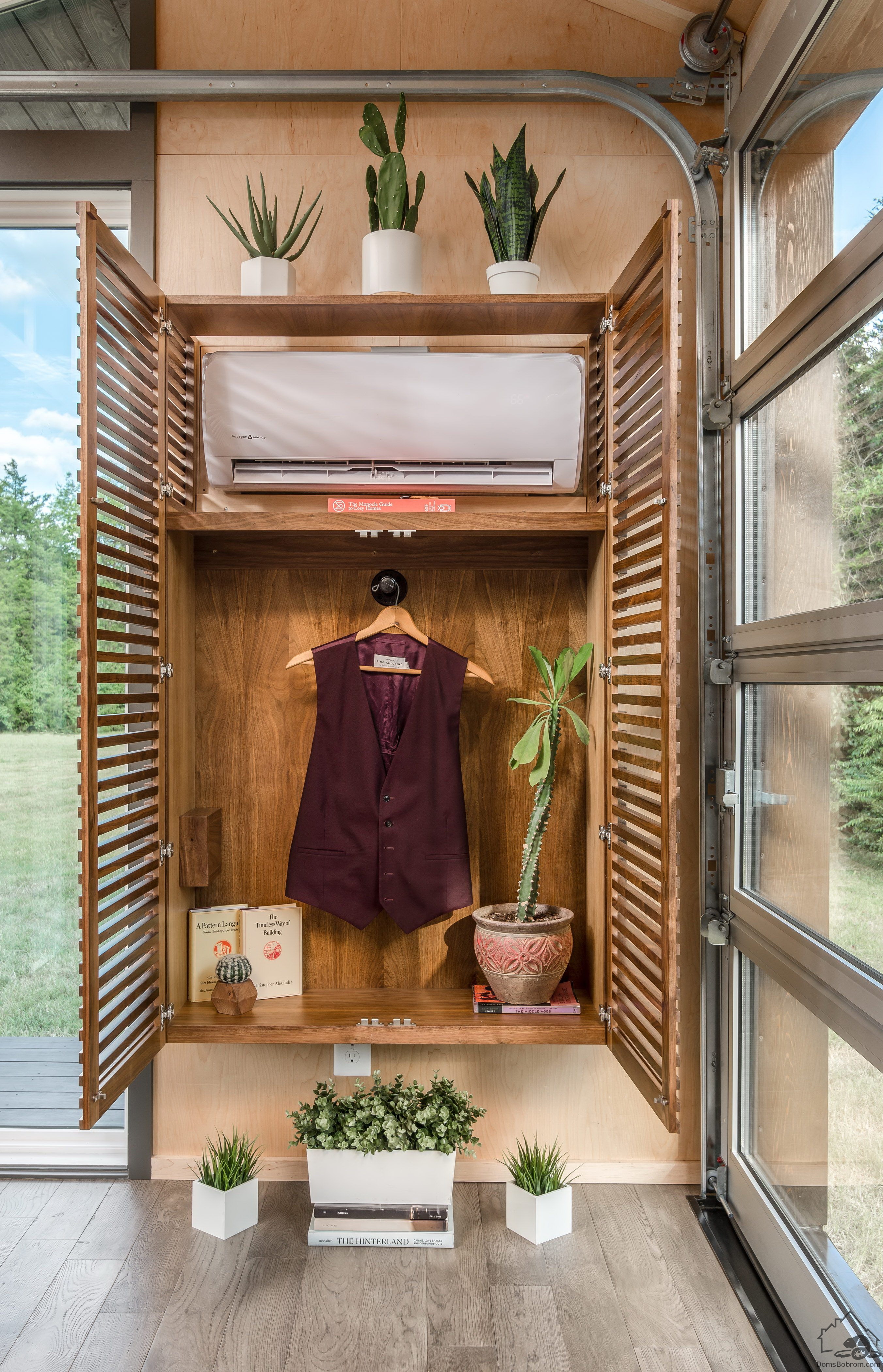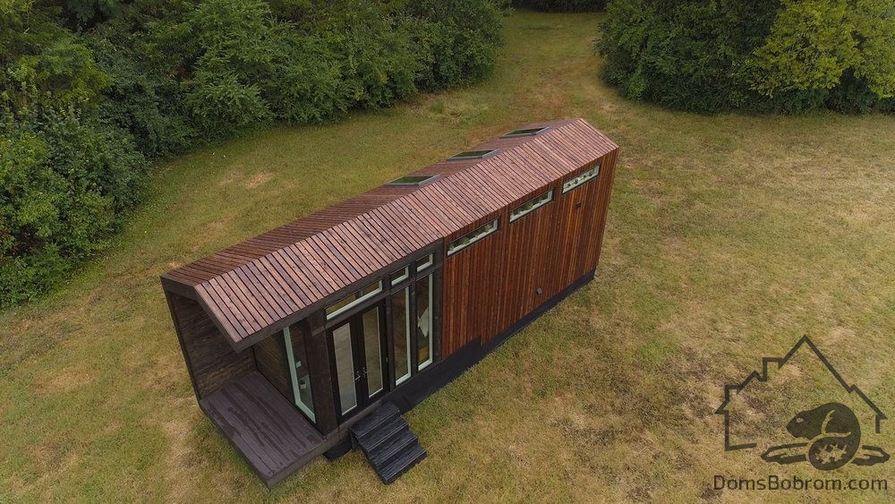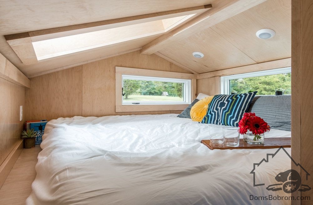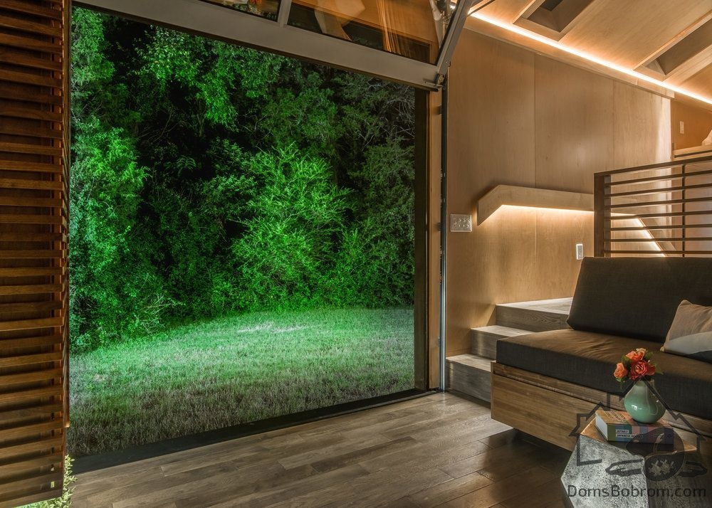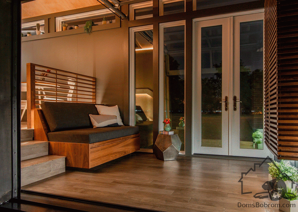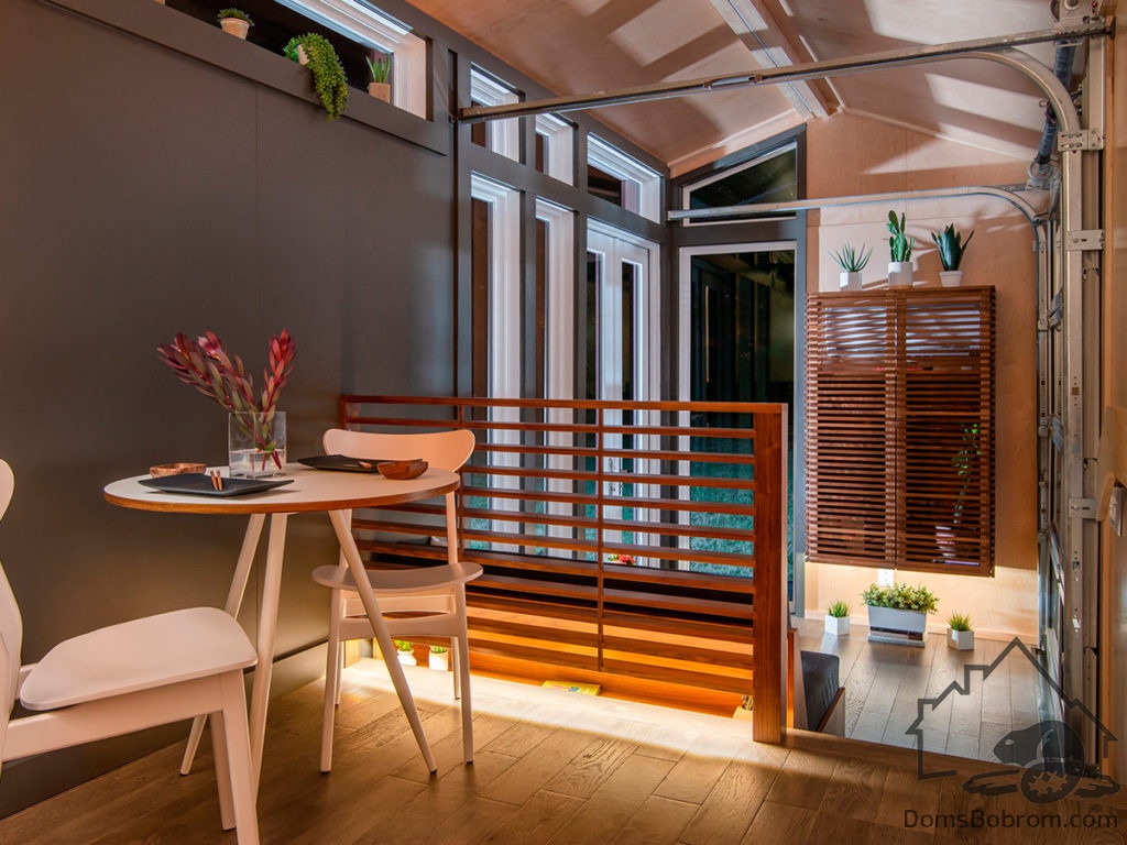 В гостиной есть компактный диван и кофейный столик, роль которого играет дизайнерский табурет. Ночью эта комната превращается в спальню: за диваном скрывается полноценная двуспальная кровать, встроенная в подиум. На подиуме установлена миниатюрная кухня, укомплектованная всем необходимым. Рядом – маленький круглый стол с двумя стульями. Кухня отделена от гостиной изящной перегородкой, дизайн которой перекликается со шкафом с реечными фасадами. Еще одна спальня оборудована наверху, во втором ярусе, находящемся за кухонным блоком. Подняться туда можно по легкой металлической лестнице. В доме есть санузел и ванная комната с душевой кабиной. Это пространство освещается с помощью трех потолочных окон и встроенной LED-подсветки.