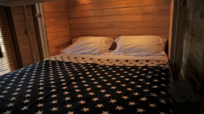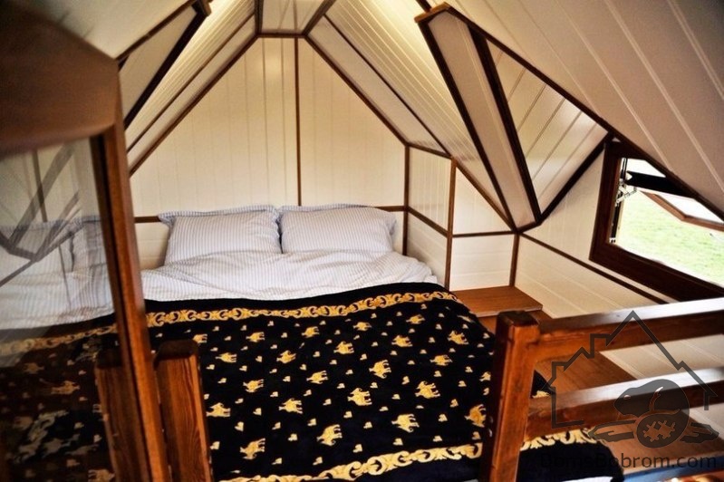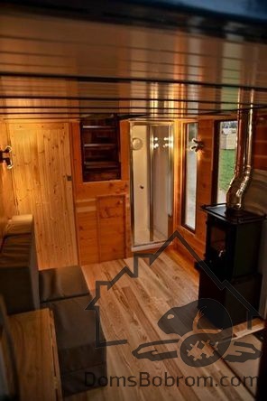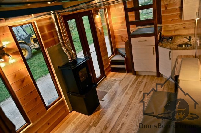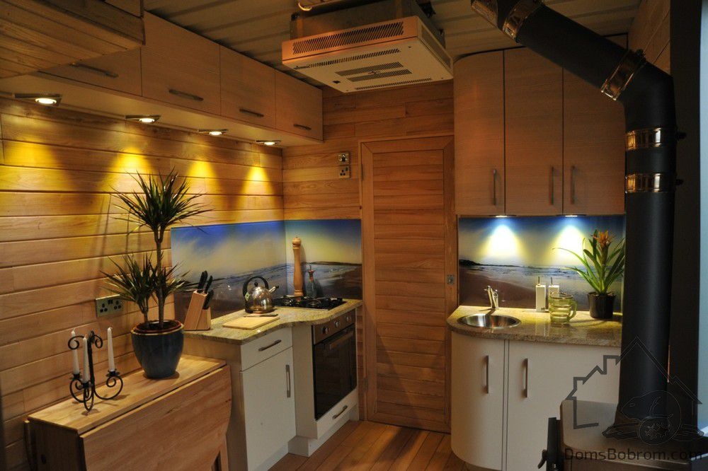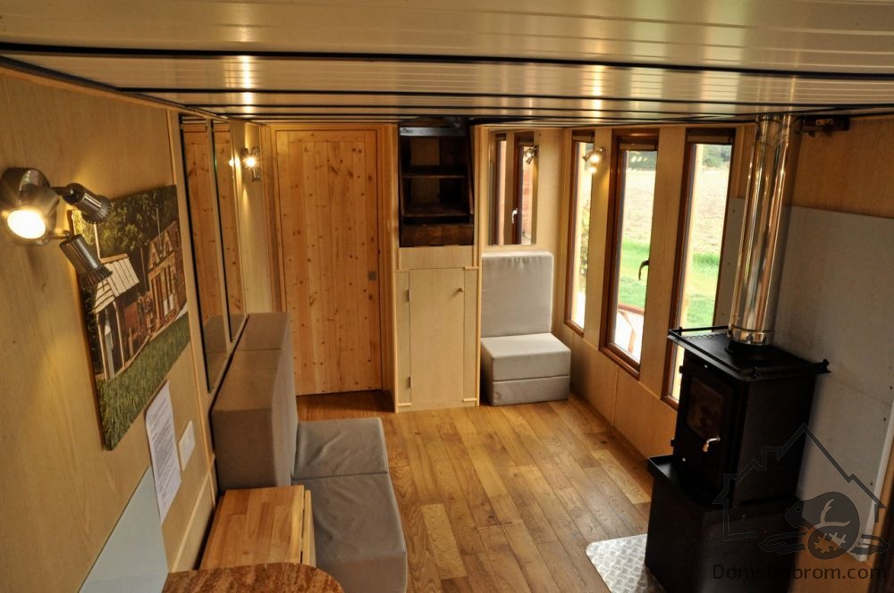 Внутри удалось обустроить полноценную кухню с вместительным холодильником и раскладным обеденным столом, санузел, мини-гостиную, оснащенную печью-камином с дымоходом, и пять спальных мест, расположенных в мансарде.
