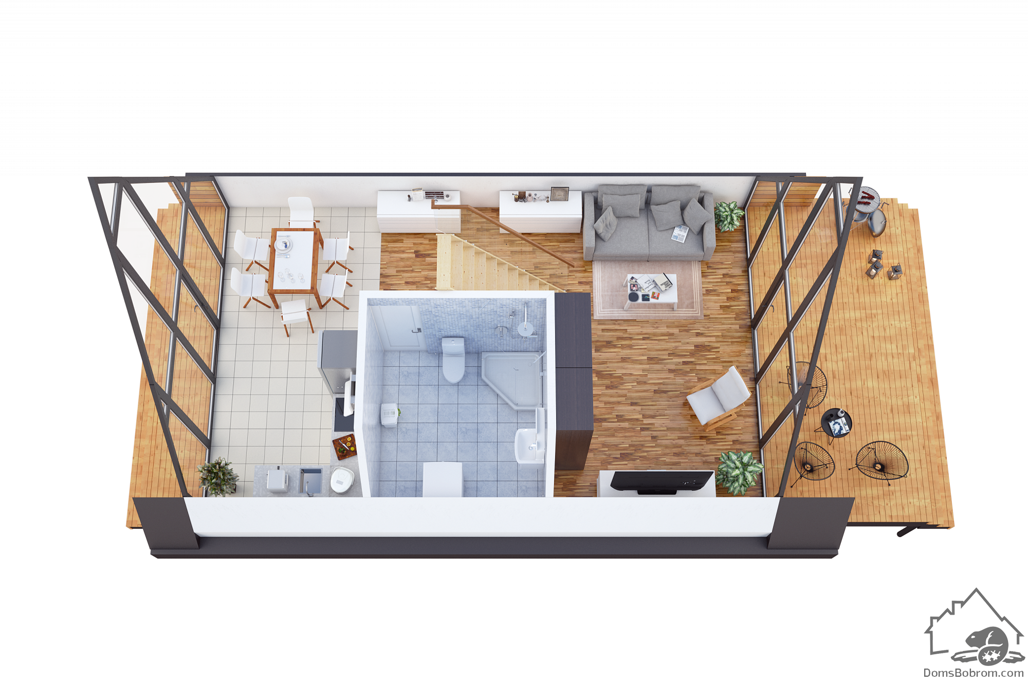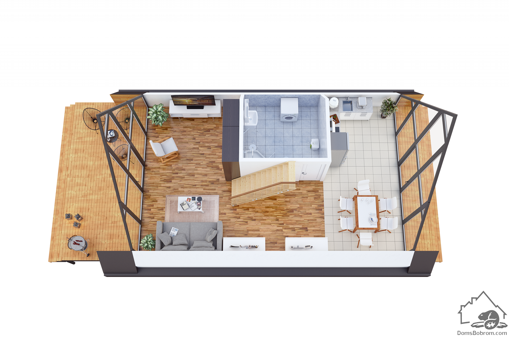 Треугольный дом Kolmio с панорамной стеной - необычное, но очень крутое и современное решение для вашей дачи. Высота дома позволяет оборудовать антерсоль со спальными местами. Но даже и без нее в нем есть все необходимое для жизни.